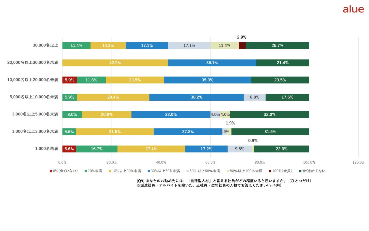 ・従業員数30,000名以上の企業のみ、「自律型人材が50%以上を占める」と回答した割合が30%を超える