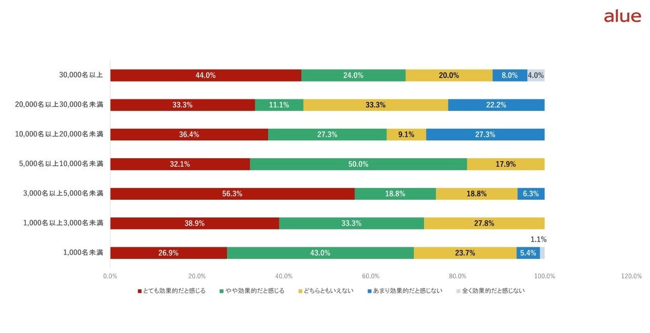 ・20,000名以上30,000名未満の企業を除き、「とても効果的」「効果的」の回答が65%以上