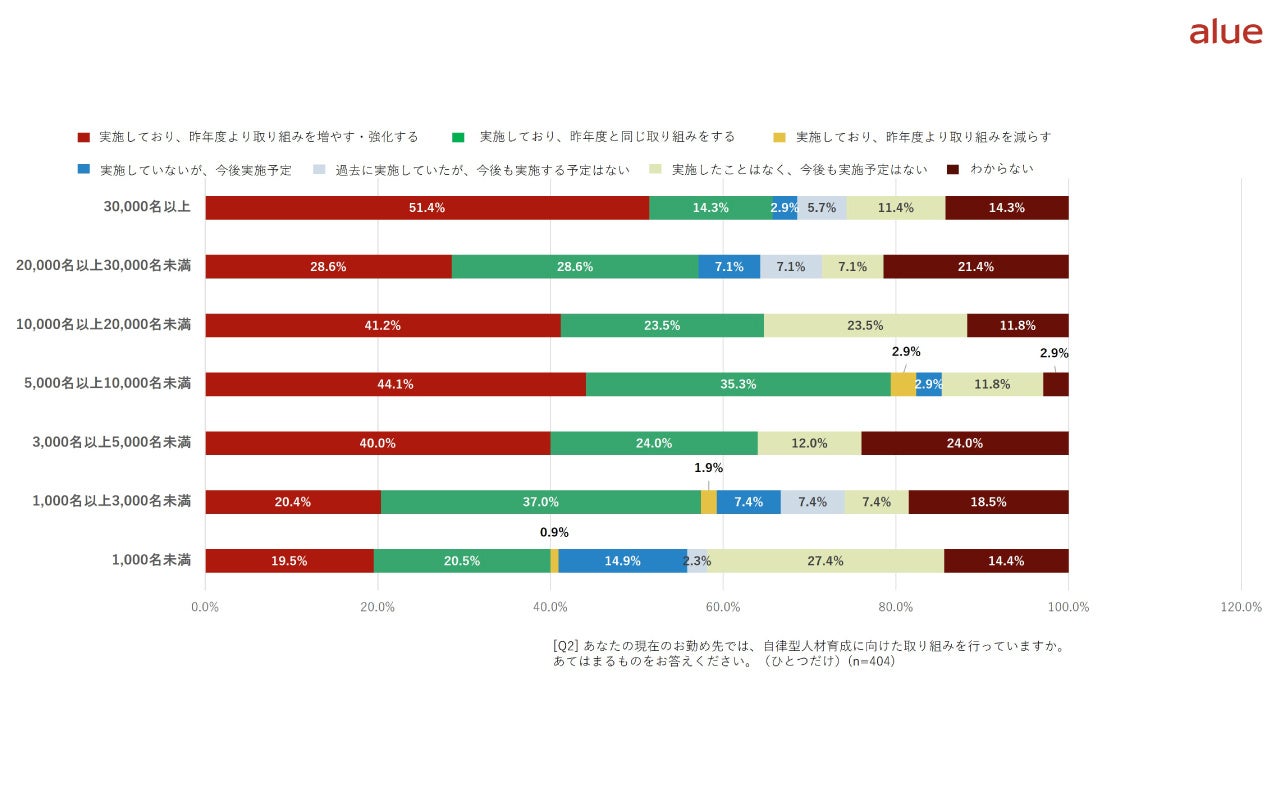 そこで当社は、従業員数100名未満~30,000名以上の、幅広い業種の企業の人事・人材開発担当者に対し、自律型人材育成の状況と課題に関するアンケート調査を実施しました。本レポートには、対象企業全体の分析結果のほか、従業員規模ごとのデータも掲載しています。