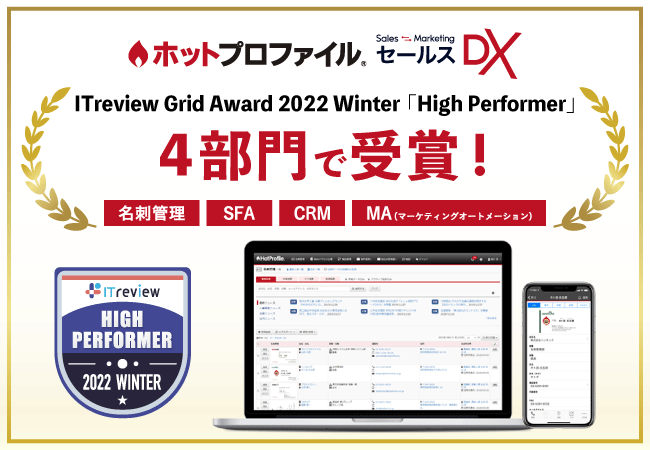 クラウド型名刺管理・営業支援ツール「ホットプロファイル」、「ITreview Grid Award 2022 Winter」4部門(名刺管理・SFA・CRM・MA)で受賞