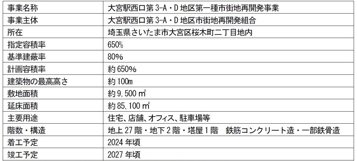 東京建物株式会社(本社:東京都中央区、代表取締役 社長執行役員:野村 均/以下、東京建物)と中央日本土地建物株式会社(本社:東京都千代田区、代表取締役社長:平松 哲郎/以下、中央日本土地建物)、大和ハウス工業株式会社(本社:大阪府大阪市、代表取締役社長:芳井 敬一/以下、大和ハウス工業)は、参加組合員予定者として「大宮駅西口第3-A・D 地区市街地再開発準備組合」(埼玉県さいたま市、理事長:望月 邦彦)とともに「大宮駅西口第3-A・D 地区第一種市街地再開発事業」(以下、本事業)を推進してまいりました。