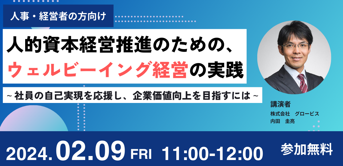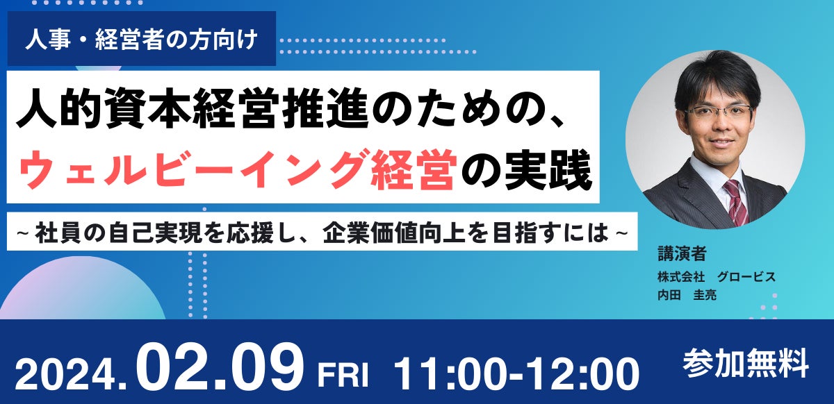 グロービスは、従業員・職員のウェルビーイングに対する企業や自治体の関心の高まりを受け、「ウェルビーイング経営」への理解をさらに深めていただくために、人事担当者向けの「ウェルビーイング経営の実践に関するセミナー」を2月9日に開催します。同セミナーでは、「働きがいのある会社」日本版で10年連続ランクインしているグロービスの経営管理本部長として「理想的な企業システム」を実現する組織にすべく自社の経営に携わってきたグロービス・コーポレート・エデュケーション マネジング・ディレクター 内田圭亮が、同社の法人研修部門において、多くの企業の経営課題に対し人・組織の側面から支援してきた経験からのインサイトも交え、講演します。