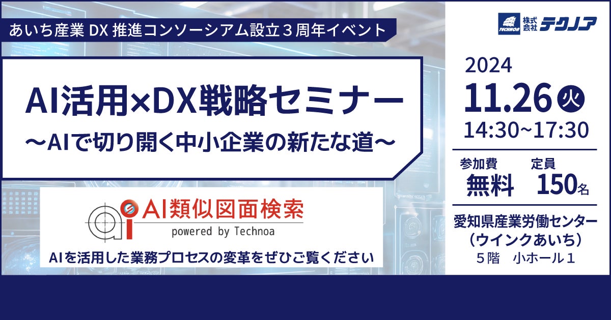 株式会社テクノア(本社:岐阜県岐阜市、代表取締役:山﨑 耕治)は、11/26に愛知県産業労働センター(ウインクあいち)で開催されるイベント「AI活用×DX戦略セミナー ~AIで切り開く中小企業の新たな道~」に出展いたします。