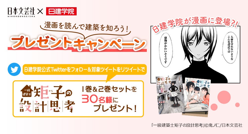 資格取得支援スクールの日建学院を運営する株式会社建築資料研究社(所在地:東京都豊島区、代表取締役社長:馬場栄一)は、日本文芸社「週刊漫画ゴラク」にて連載中の漫画『一級建築士矩子の設計思考』(鬼ノ仁/日本文芸社)とコラボし、抽選で30名様に漫画『一級建築士矩子の設計思考』1巻・2巻セットが当たるTwitterプレゼントキャンペーンを開催中です。