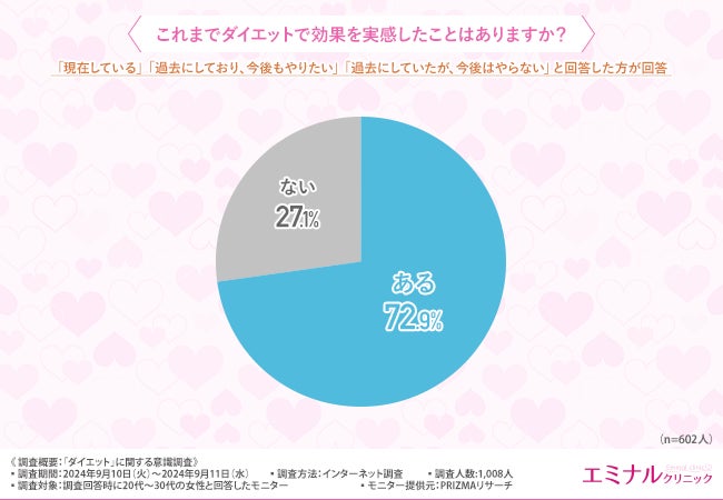 そこで、「これまでダイエットで効果を実感したことはありますか?」と質問したところ、約7割の方が『ある(72.9%)』と回答しました。