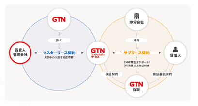 「GTN Fair Lease」は、GTNグループのGTNコンシェルジュサービス(GCS)が貸主からお部屋を賃借(マスターリース)し、外国人入居者に転貸契約(サブリース)を結ぶことで、個人契約によるGTNの家賃保証サービスを直接導入しない場合でも、外国人入居希望者への対応を円滑に進められる環境づくりを支援するサービスです。審査・多言語サポート・生活フォローなど、外国人受入れに必要なサポートをGTNグループ内で一気通貫に提供いたします。