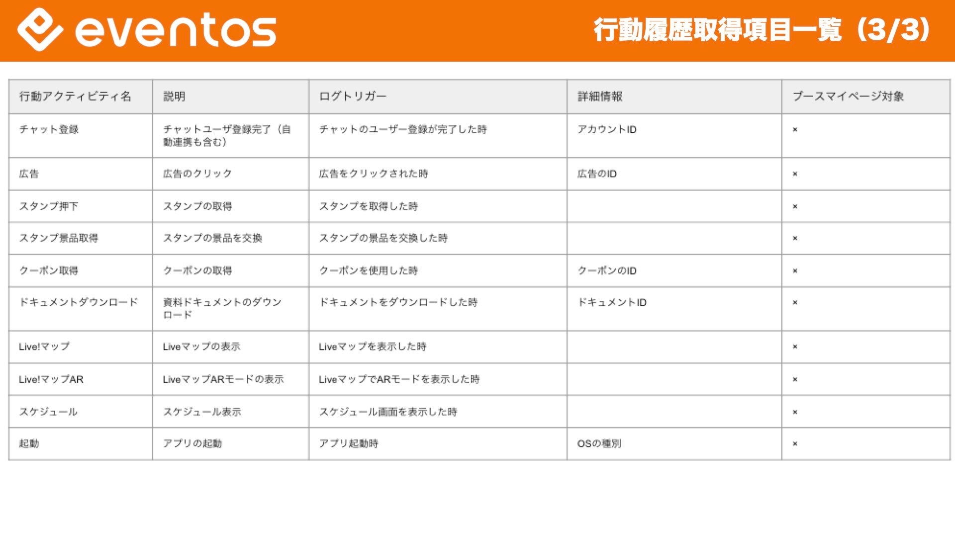 イベントやブース単位でソートした際は、イベントやブースにおける行動履歴の取得が可能となります。