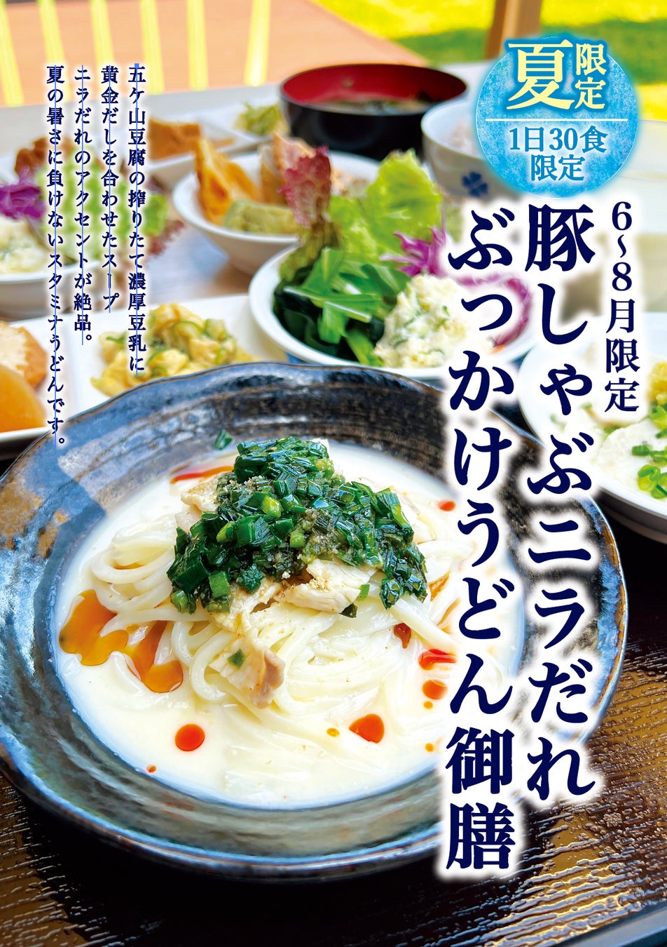 【五ケ山豆腐】夏の味覚を堪能!夏季限定メニュー「豚しゃぶニラだれぶっかけうどん御膳」のご紹介