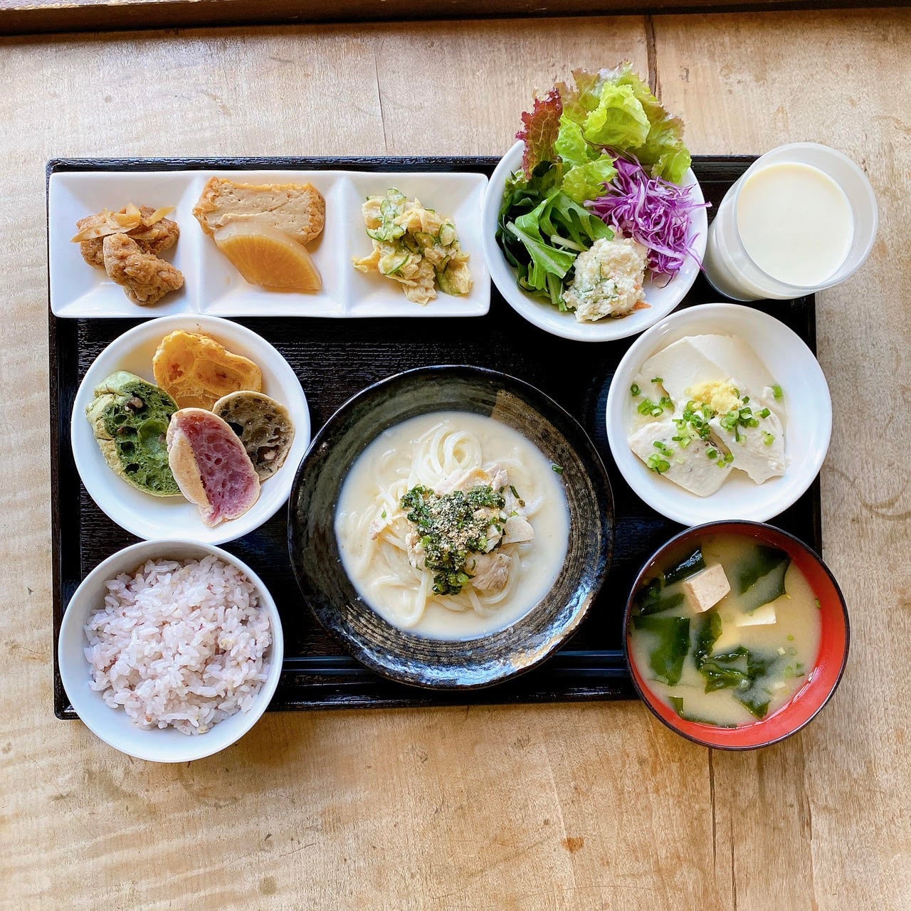 五ケ山豆腐や名物もちもちぱん、新鮮なサラダなどが食べ放題でついており、