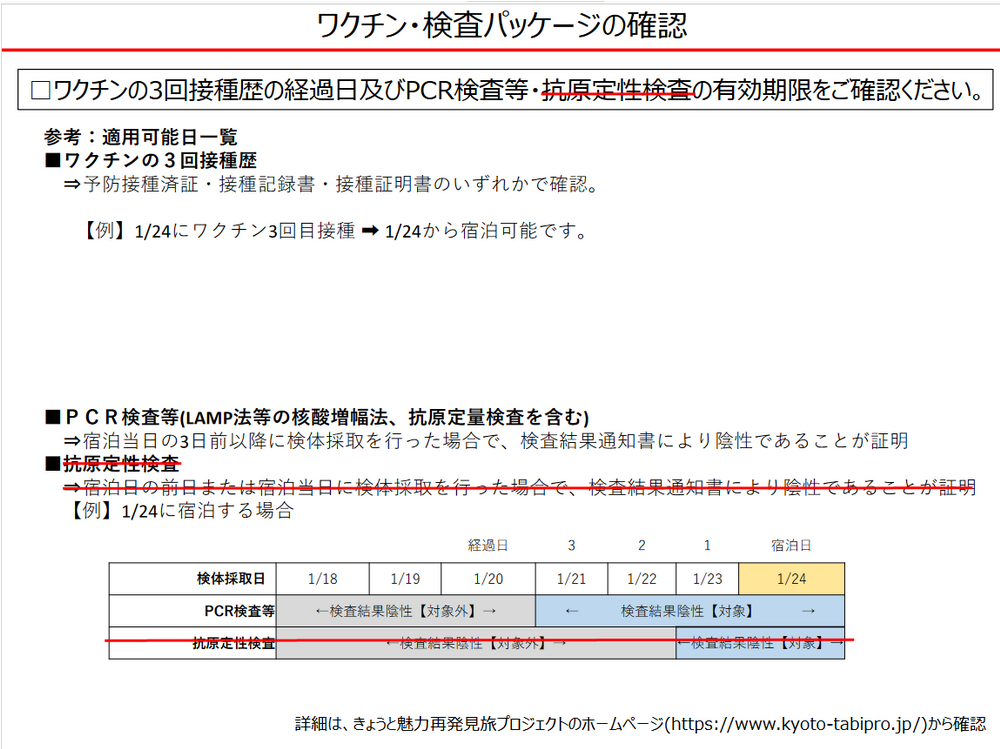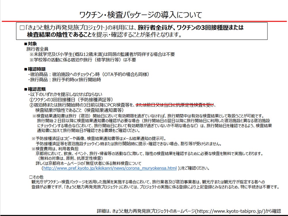 接種済証またはPCR検査等結果通知書(撮影画像、コピー、電子的な証明書でも可)の確認は、同行者も含めて旅行者全員について実施しますので、チェックイン時(旅行会社の場合は予約証明書等お渡しの来店時)にご提示ください。提示のない場合は割引支援を受けることができません。