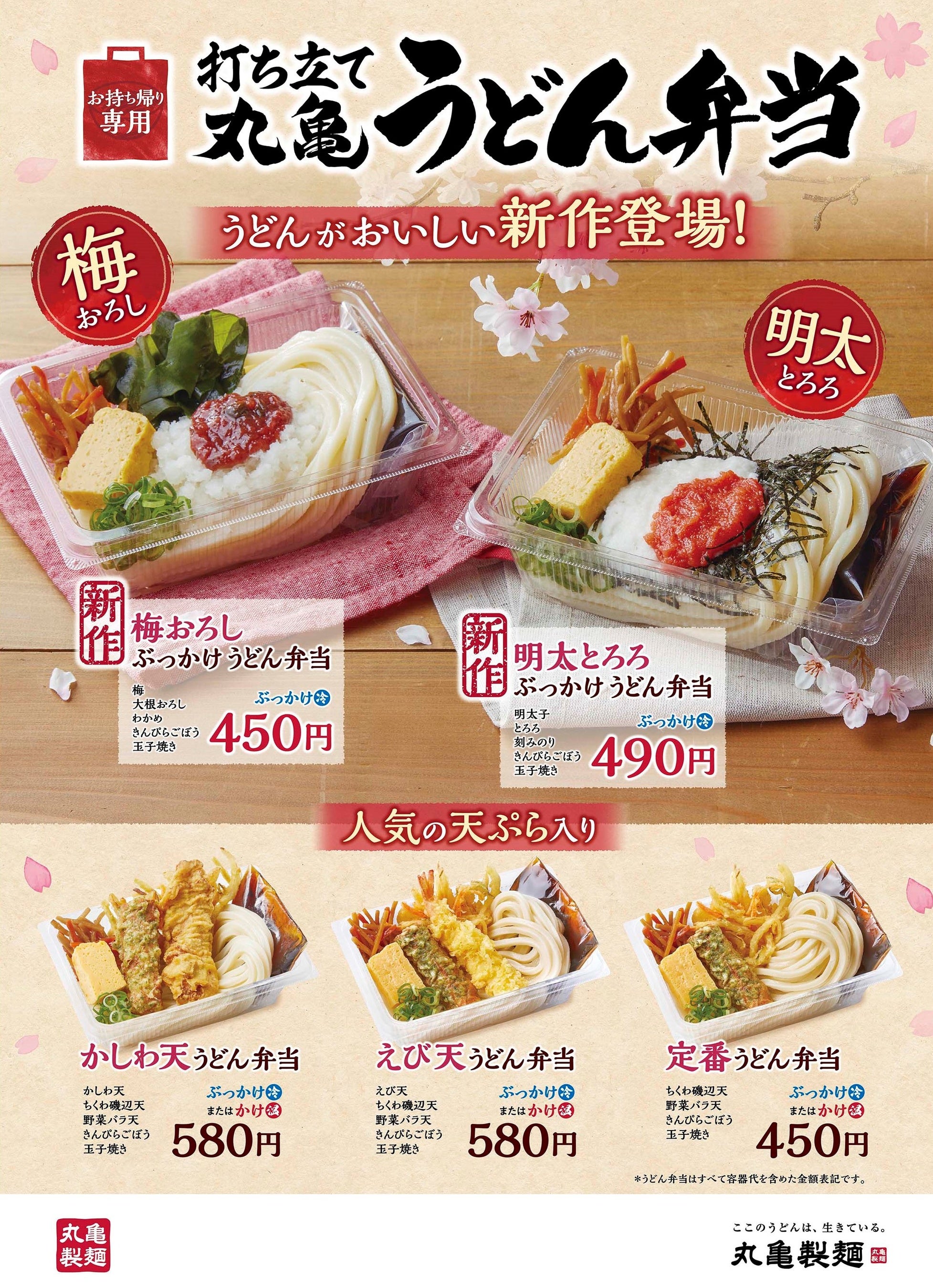 春の行楽にもぴったり!「丸亀うどん弁当」人気の天ぷら入り定番3種に加えて春の新作2種が登場