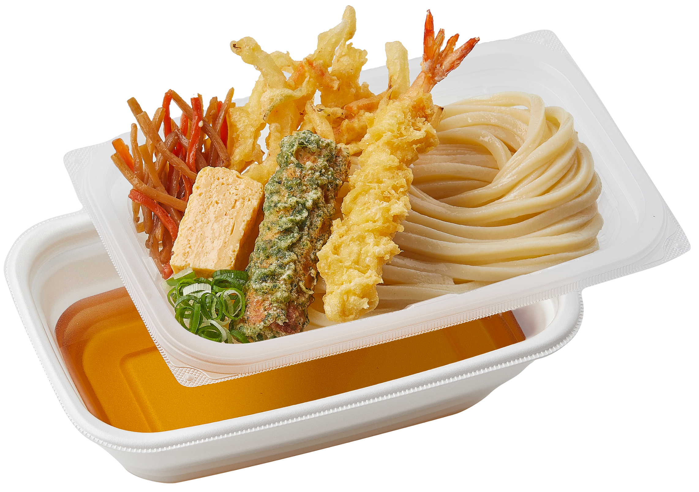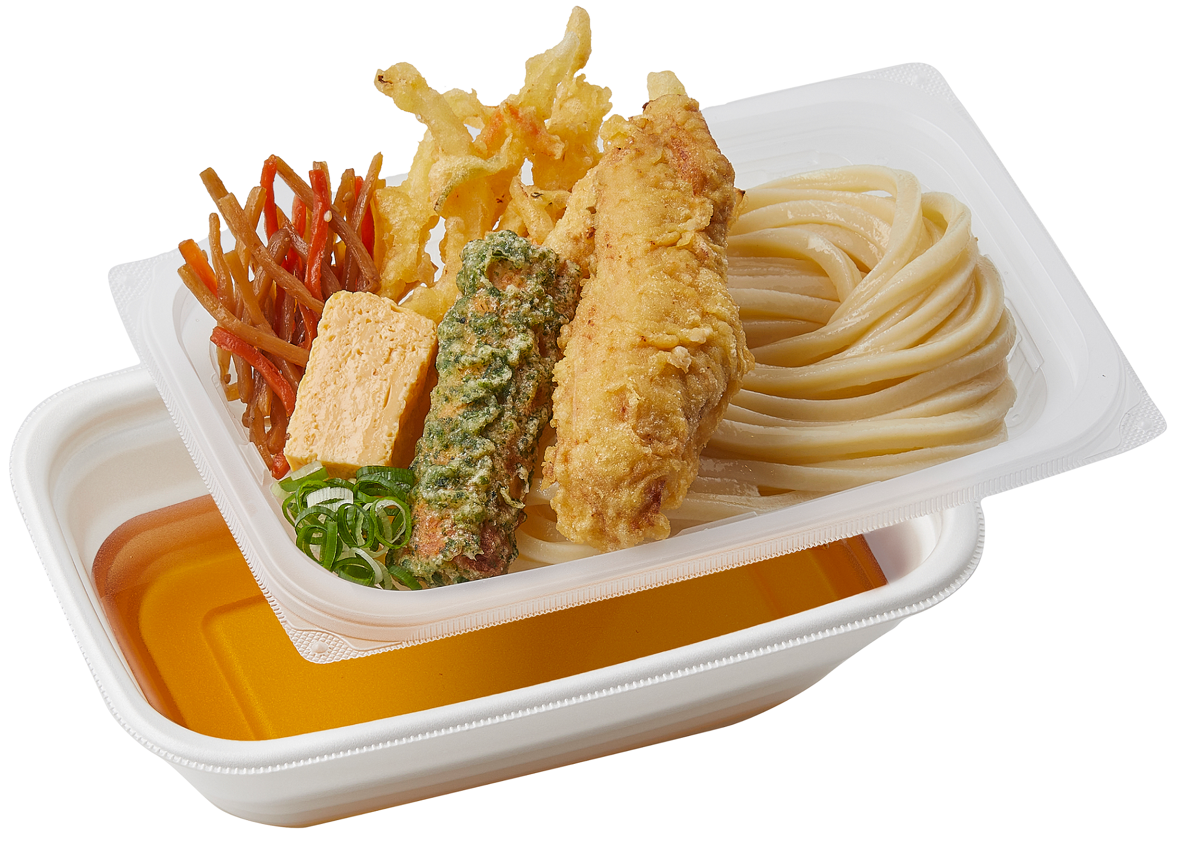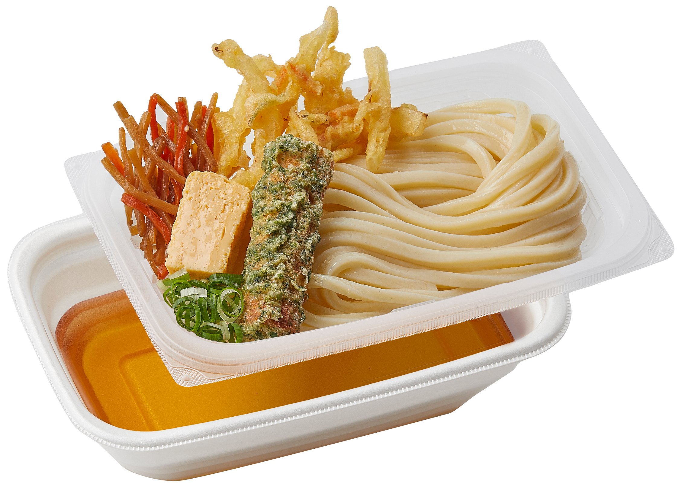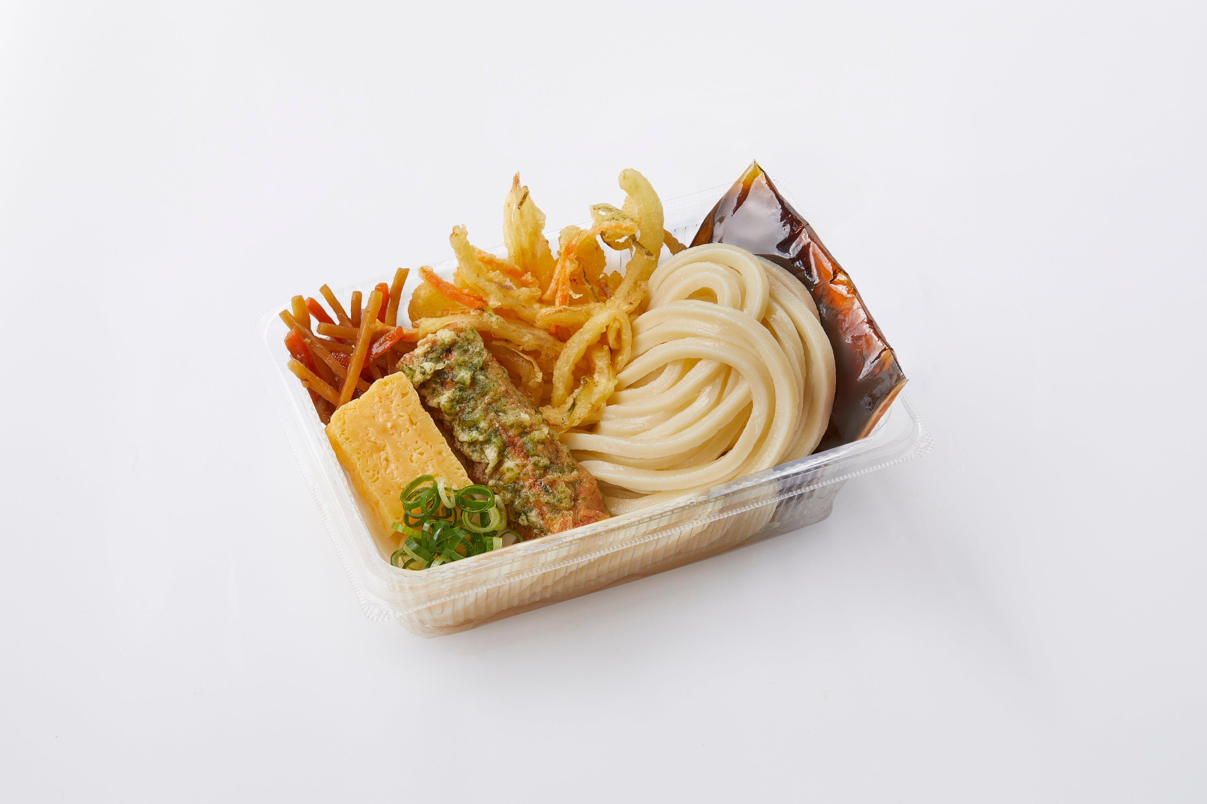 風味豊かですっきりとした味わいの定番のかけうどんは、打ち立てのうどんと熱々のだしが分かれているので、お弁当でもお店と変わらないもちっとした食感が楽しめます。天ぷらとおかずを、お店でつくる風味豊かなかけだしにたっぷりと浸すことで旨みが染み出し、打ち立ての麺に絡みます。