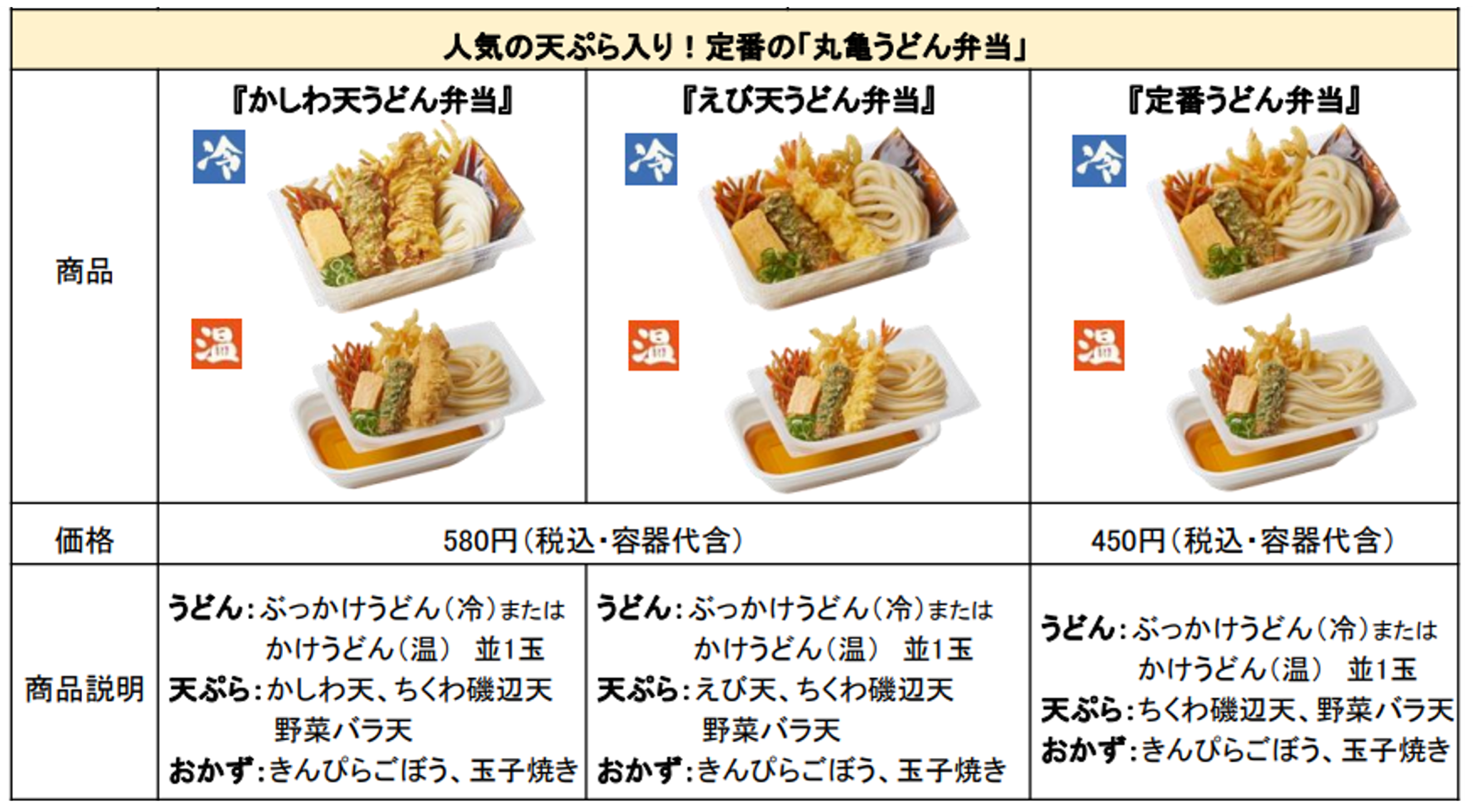 丸亀製麺ならではの粉からつくる打ち立てうどん・お店仕込みの天ぷら・定番おかず2種を一度に楽しめる定番の「丸亀うどん弁当」も継続してお買い求めいただけます。温かいかけうどんと冷たいぶっかけうどんのお好きな方をお楽しみください。