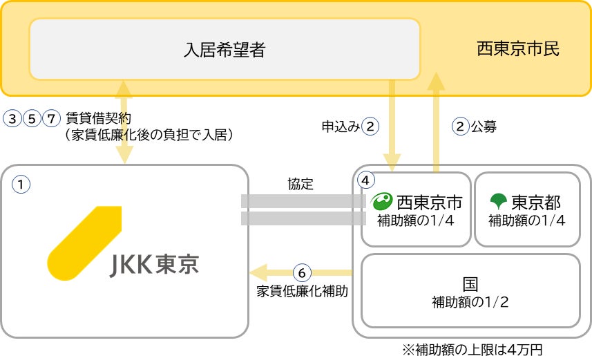 ④ 西東京市は入居希望者の世帯所得等を審査し、家賃低廉化補助(市1/4・都1/4・国1/2)の交付を決定