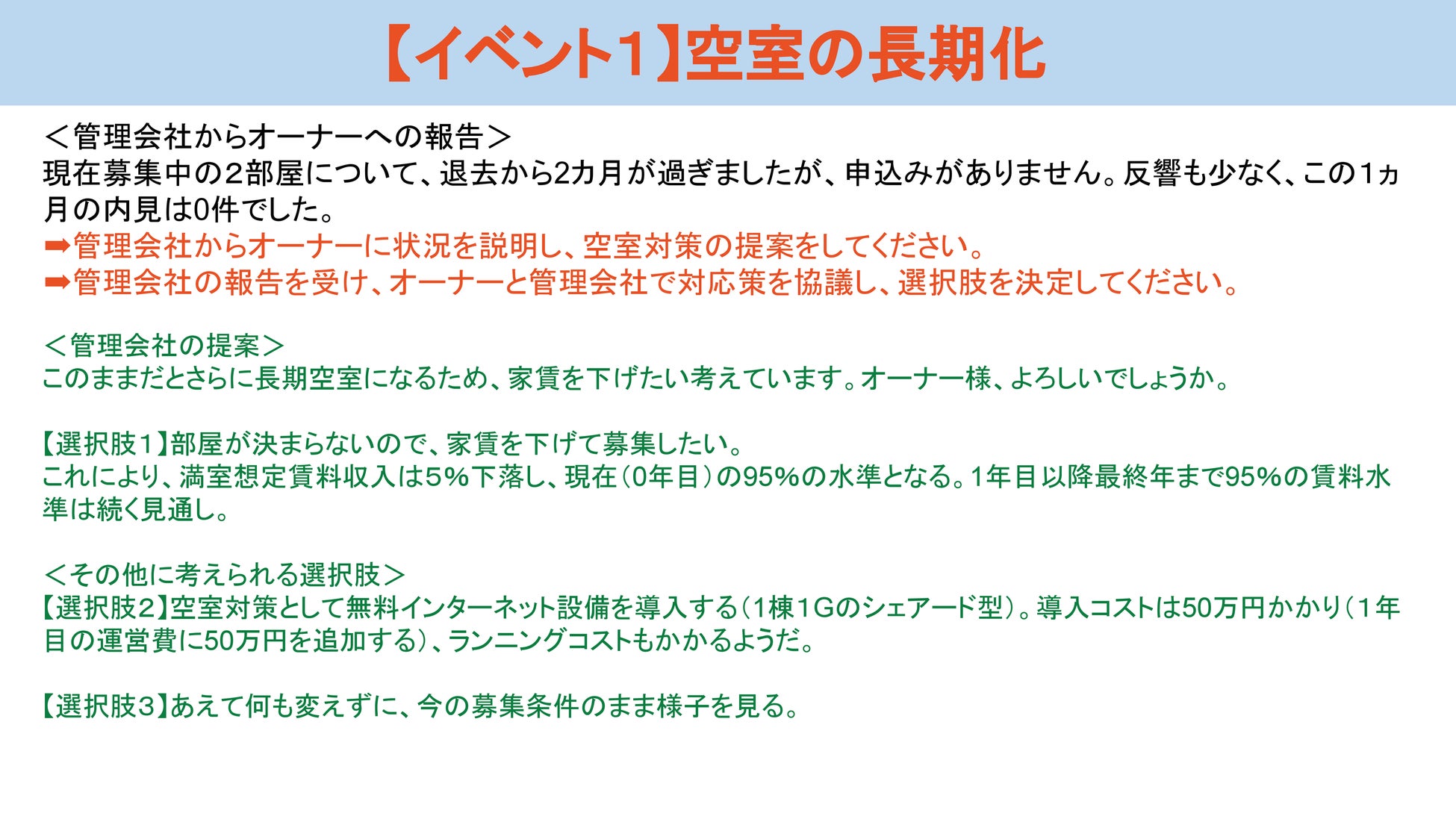 本研修は、プロパティマネジメントコンサルティング事業を展開するオーナーズエージェント株式会社が講師を務めました。前半の「知識編」では、オーナー様の多様な属性に応じた属性別の特徴(強み・弱み・関心事)や、リスク・リターンに対する思考タイプ分類を学習します。後半の「演習編」では、オーナー様役になりきるシナリオワークで意思決定プロセスだけでなく、キャッシュフローの変化や管理会社とのコミュニケーションまで含めた疑似体験を行います。