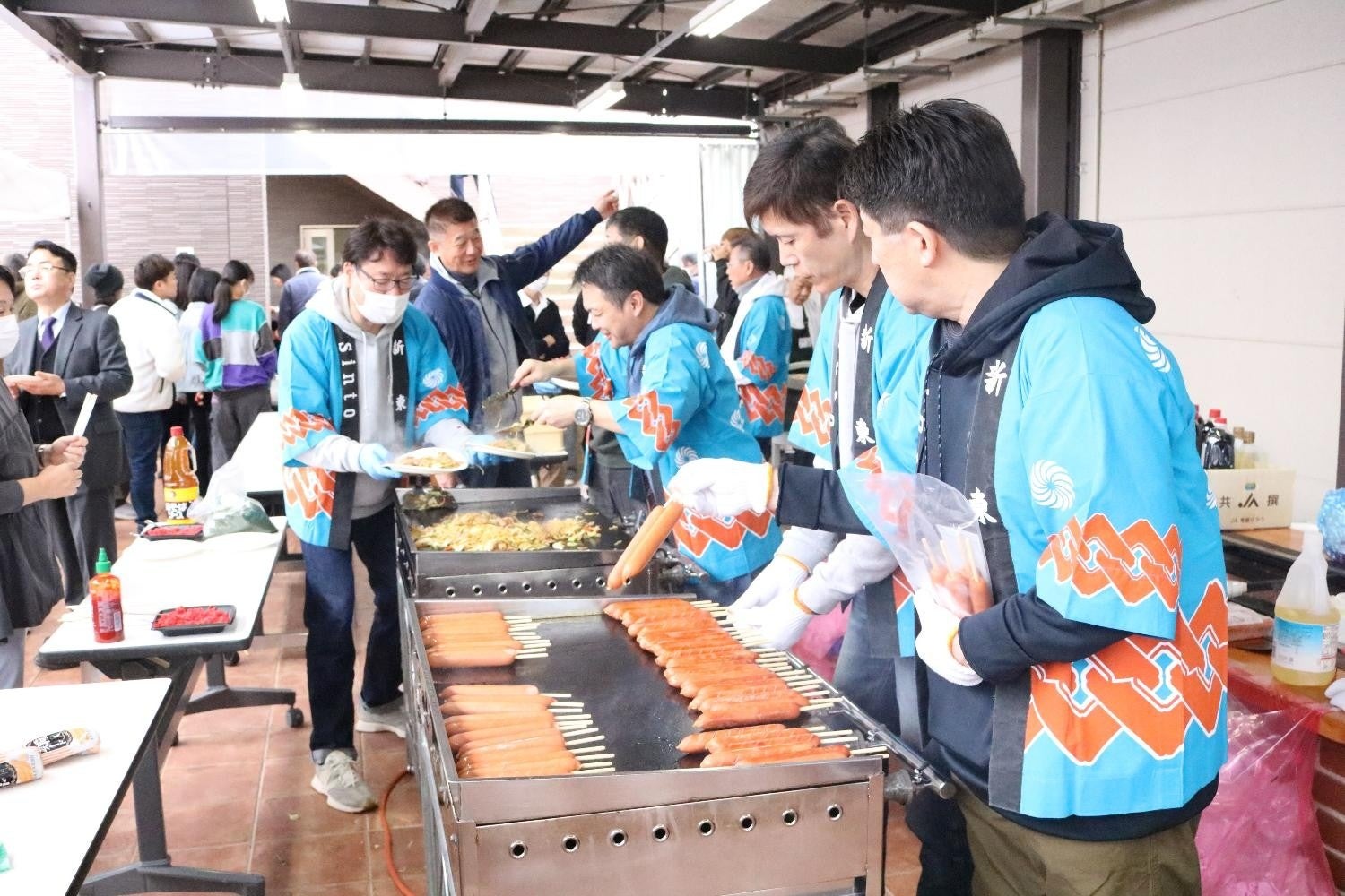 この日は小雨が降るあいにくの天候になりましたが、役員、社員とご家族、協力会社、海外拠点役員など総勢520名が参加し、会場は熱気と笑顔に包まれました。つきたてのお餅やおしるこ、天ぷら、焼きそば、ピザ、フライドポテトやドリンク類の飲食類の提供が振る舞われ、和やかな雰囲気の中で、参加者がお互いに日頃の労をねぎらうとともに絆を深めました。当初予定されていた恒例の餅まきや菓子まきは雨で中止になったため、用意されていた餅や菓子はお土産として笑顔でお持ち帰りいただき、大盛況のベントとなりました。