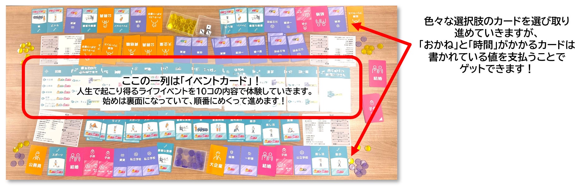 『ライフプロデュース』は、カードゲームを通じて仮想の人生を体験し、将来に向けた計画や準備の大切さを学ぶことを目的とした当社開発のプログラムです。