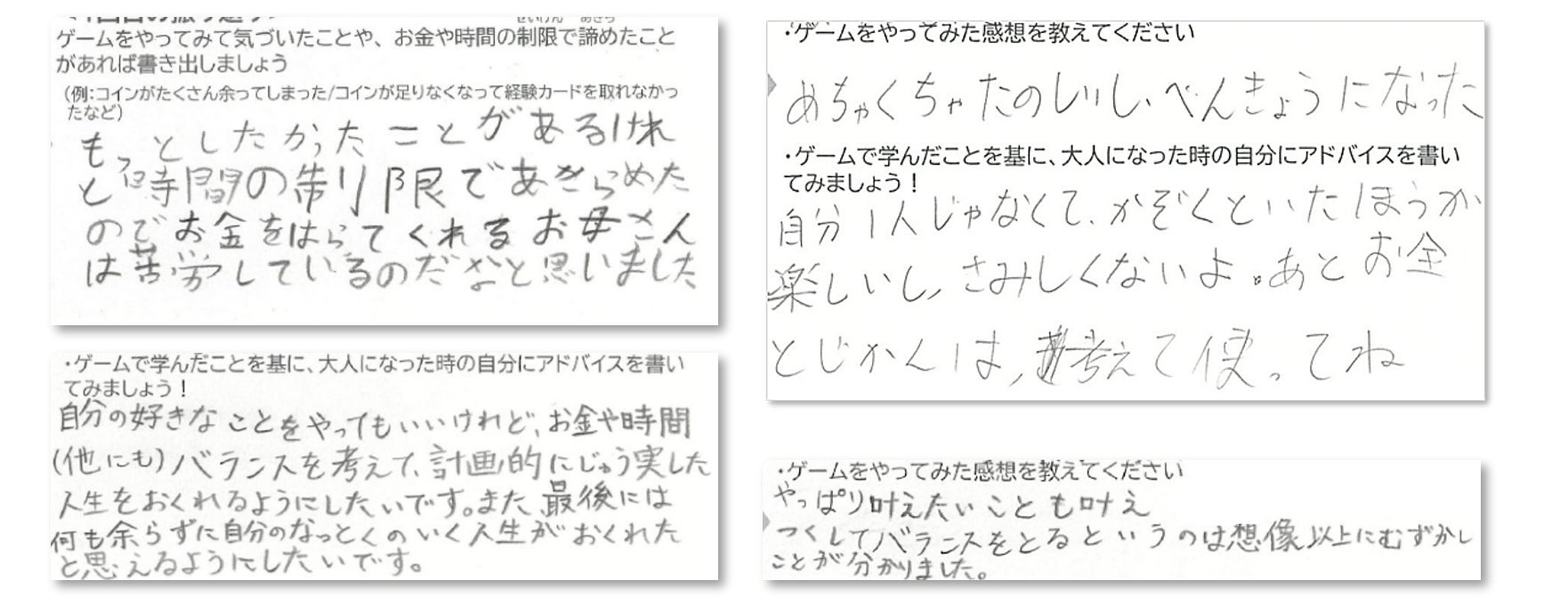 その中で、授業を受けたお子様から「親の苦労を知った」「やり繰りする大変さを学べた」「家族との時間は大切だと感じた」などという感想や、保護者の方からも「子供と一緒にやりたい」「家庭でも使いたい」という声を多数お寄せいただきました。