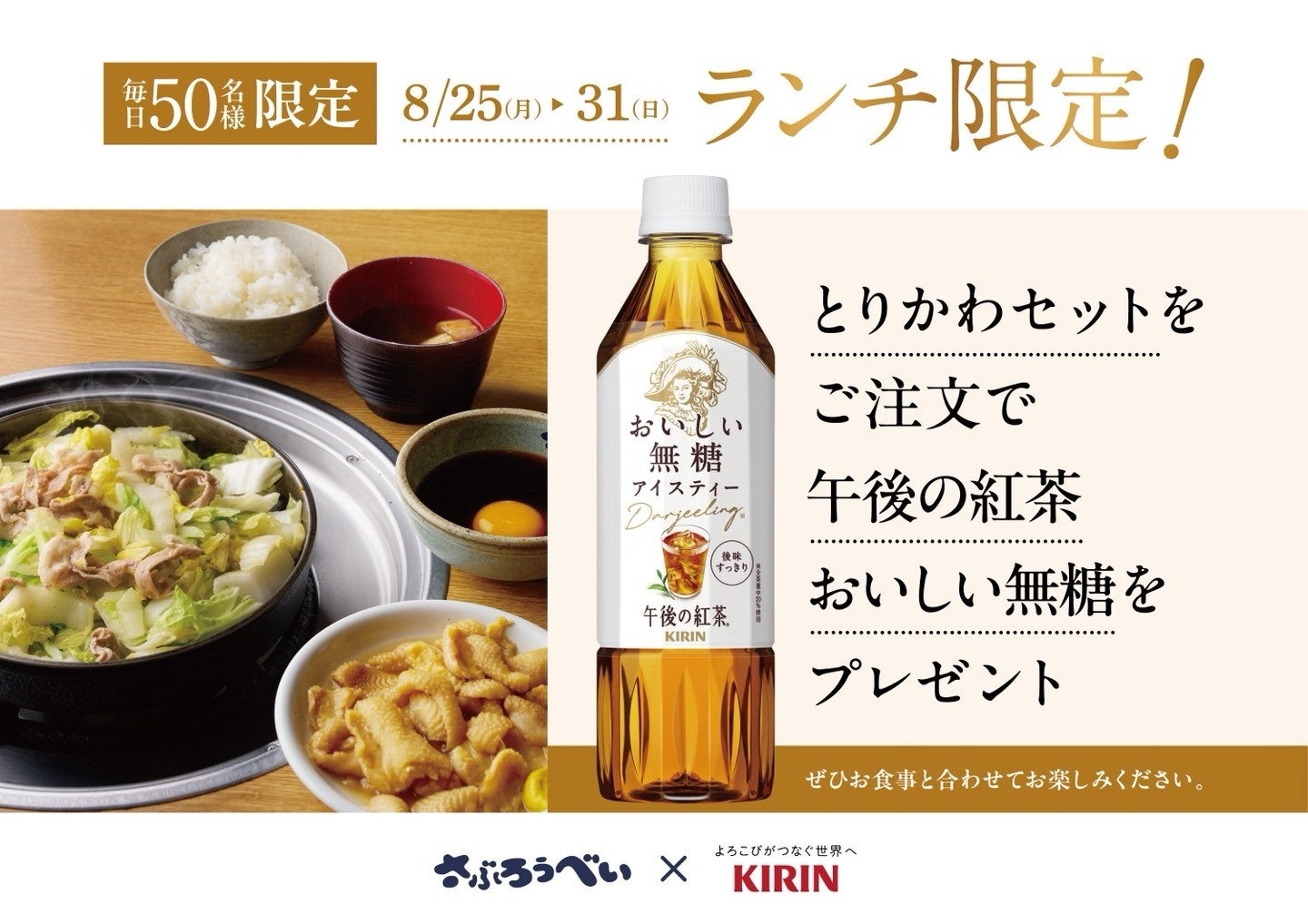 石川県のソウルフードとして、75年に渡り愛される「さぶろうべい」を展開する株式会社SU-BEE(本社:石川県金沢市、CEO:田端 弘一)は、さぶろうべい5店舗にて、ランチタイムにとりかわセットをご注文のお客様に、「キリン 午後の紅茶 おいしい無糖」を1日50名様限定でプレゼントするキャンペーンを、2025年8月25日(月)〜31日(日)までの期間限定で実施いたします。
