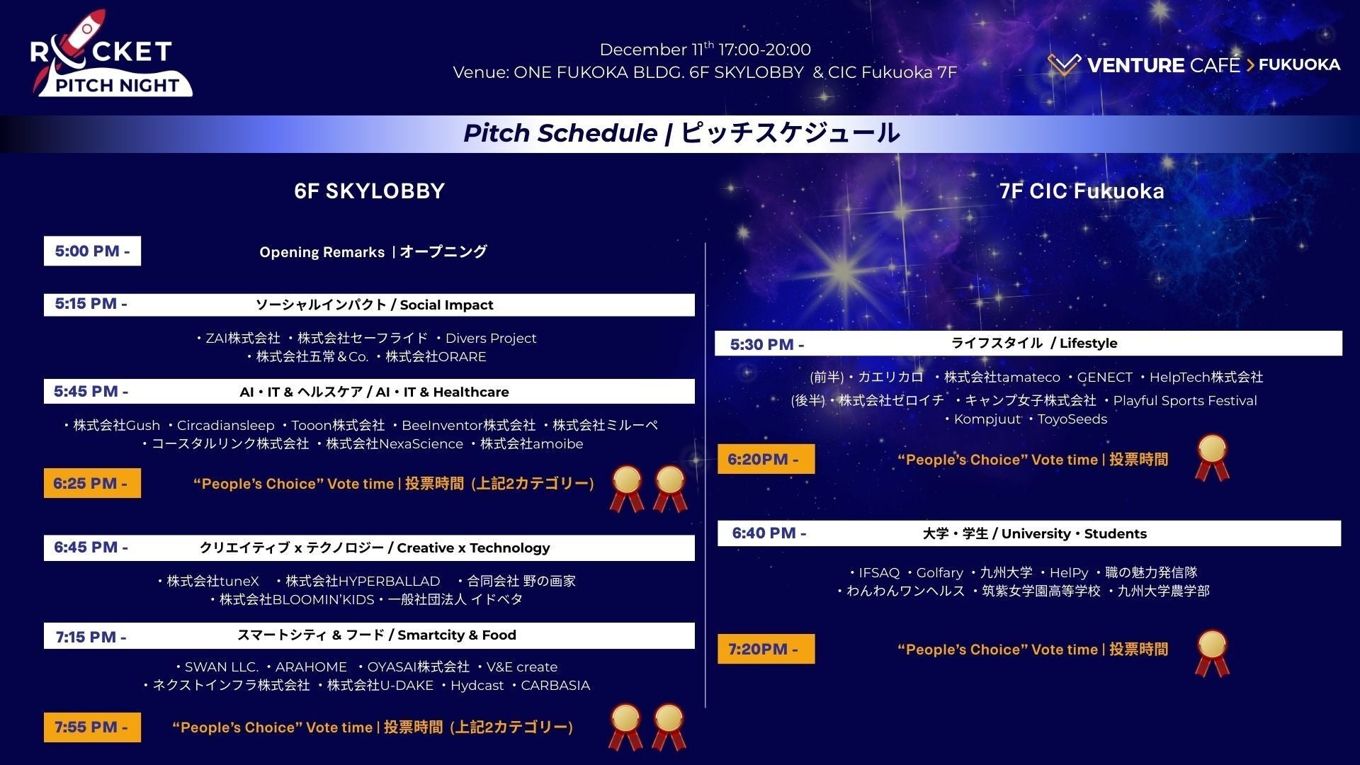 CIC Japan(本社:東京都港区、創業者兼CEO:ティム・ロウ)が運営する Venture Café Fukuoka が2025年12月11日に ONE FUKUOKA BLDG.(ワン・フクオカ・ビルディング) SKY LOBBYで「 ROCKET PITCH NIGHT FUKUOKA 2025 」を初開催いたします。