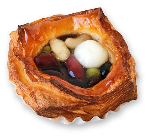 「あんこが大好きだけど実際にあんぱんを買う機会はほとんどない」「白玉とあんこのスィーツは大好きだから、パンになれば買ってみたい!」「パイのような生地を使用して和と洋を楽しみたい」という発案者の想いから誕生した一品。デニッシュ生地に、やさしい甘さの小倉あんを重ね、彩り豊かな五色豆をトッピング。仕上げには「月」に見立てた白玉をのせ、和の趣を感じるスイーツパンに仕上げました。和菓子のような上品な味わいと、デニッシュならではの軽やかな食感を同時に楽しめる一品です。