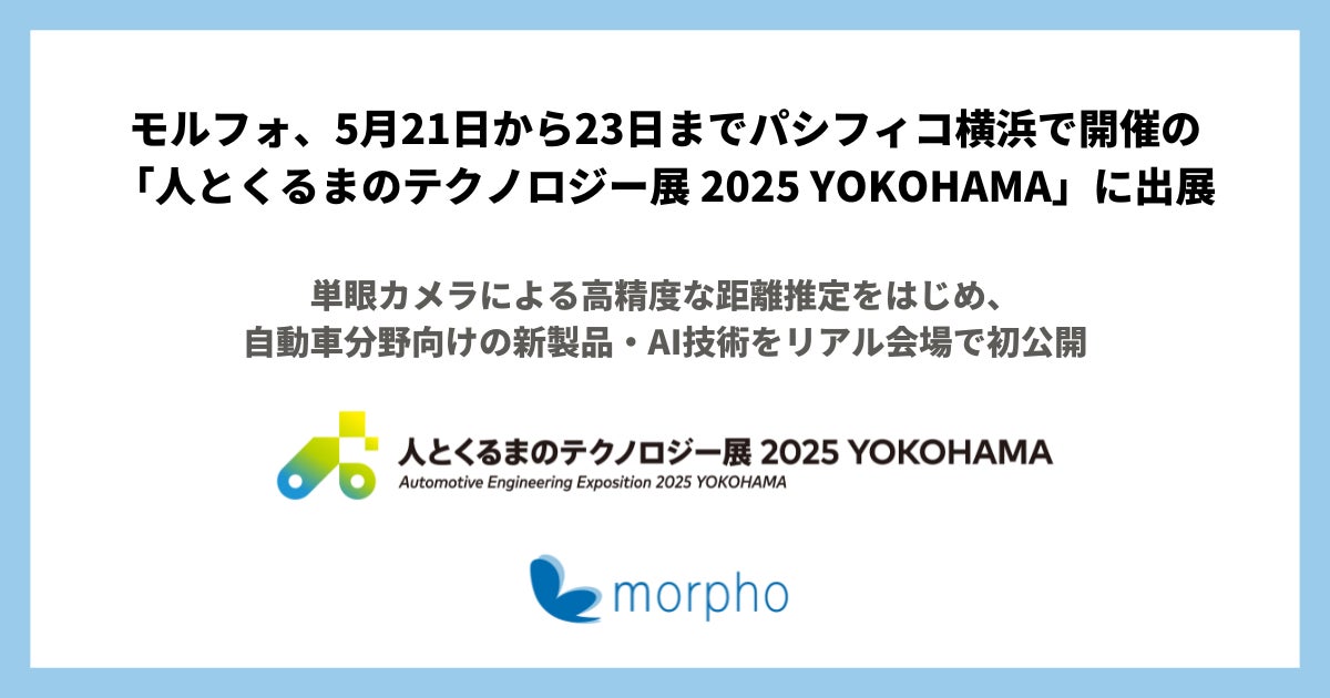 株式会社モルフォ(本社 : 東京都千代田区、代表取締役社長:平賀 督基、東証グロース市場:3653、以下 : モルフォ)は、2025年5月21日(水)から23日(金)までの3日間、パシフィコ横浜で開催される「人とくるまのテクノロジー展 2025 YOKOHAMA」に出展します。