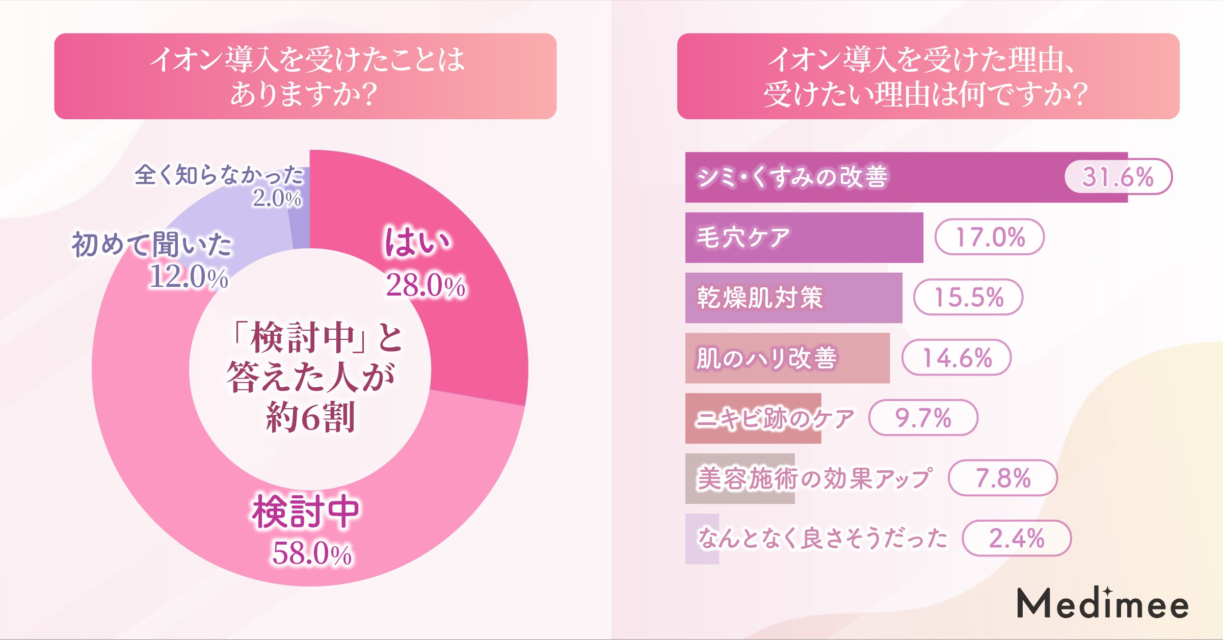 調査では、すでにイオン導入を「受けたことがある」と答えた人が約3割、「検討中」と回答した人が約6割にのぼり、美容施術として一定の認知と実績を持ちながらも、関心を寄せつつまだ体験していない層が多いことがわかりました。