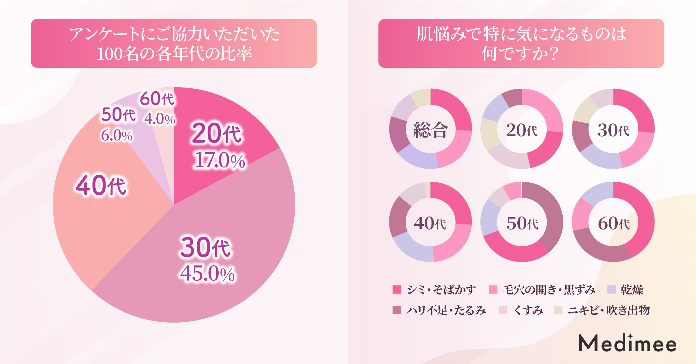 今回アンケートにご協力いただいた100名の各年代の比率と肌悩みは、以下です