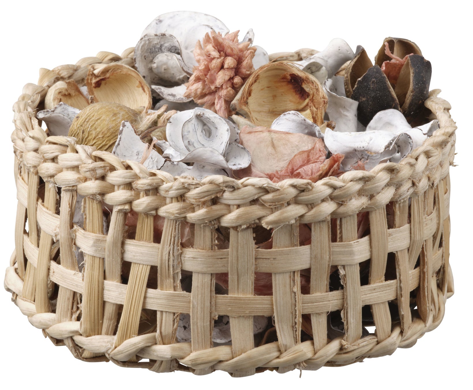 バナナ繊維を手編みした装飾的なバスケットに、インドの植物生産で出た廃材を使った香り付きポプリを詰めました。そのまますぐテーブルに置いて飾れます。