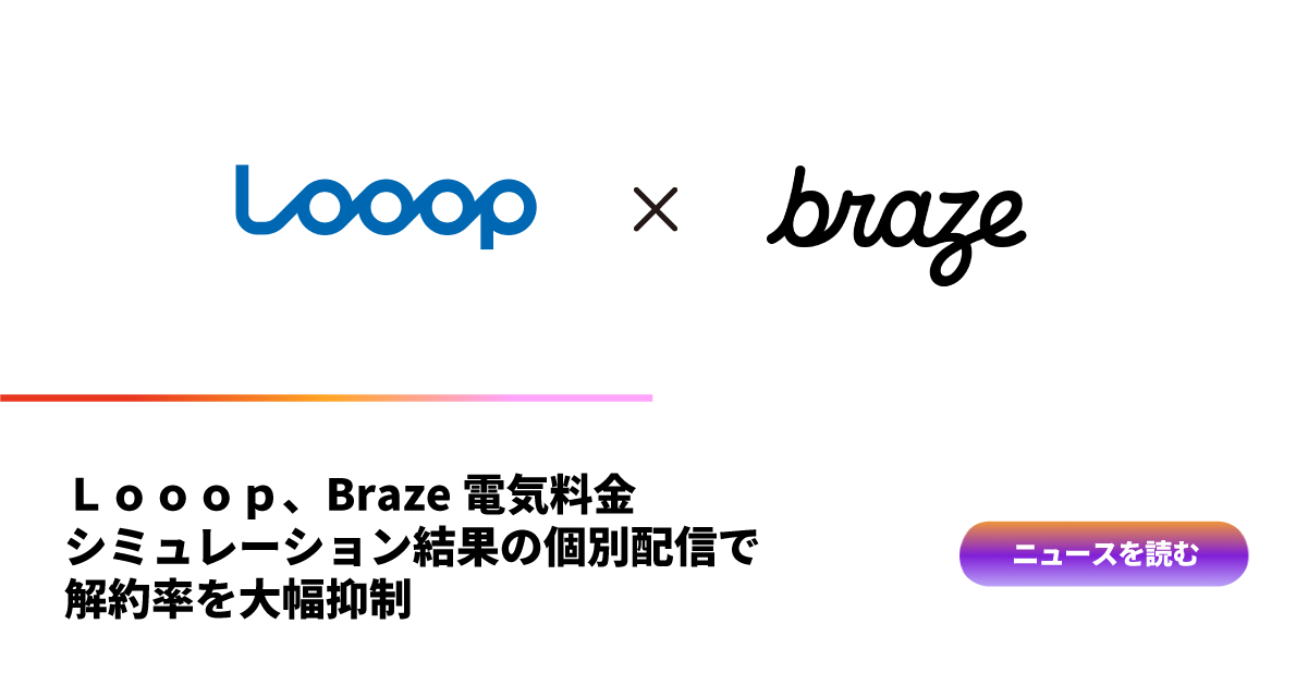 カスタマーエンゲージメントプラットフォームのリーダーである Braze株式会社(読み方:ブレイズ、本社:東京都港区、代表取締役社長:水谷 篤尚、以下「Braze」)は、「エネルギーフリー社会の実現」をビジョンに掲げ、再生可能エネルギーのニーズ喚起と普及を目指す株式会社Looop(本社:東京都台東区、代表取締役社長 CEO:森田 卓巳、以下「Looop」)が、顧客エンゲージメントプラットフォーム「Braze(ブレイズ)」導入し、個別にパーソナライズされたコミュニケーションから開始し、顧客エンゲージメントの高度化を目指すことを発表します。