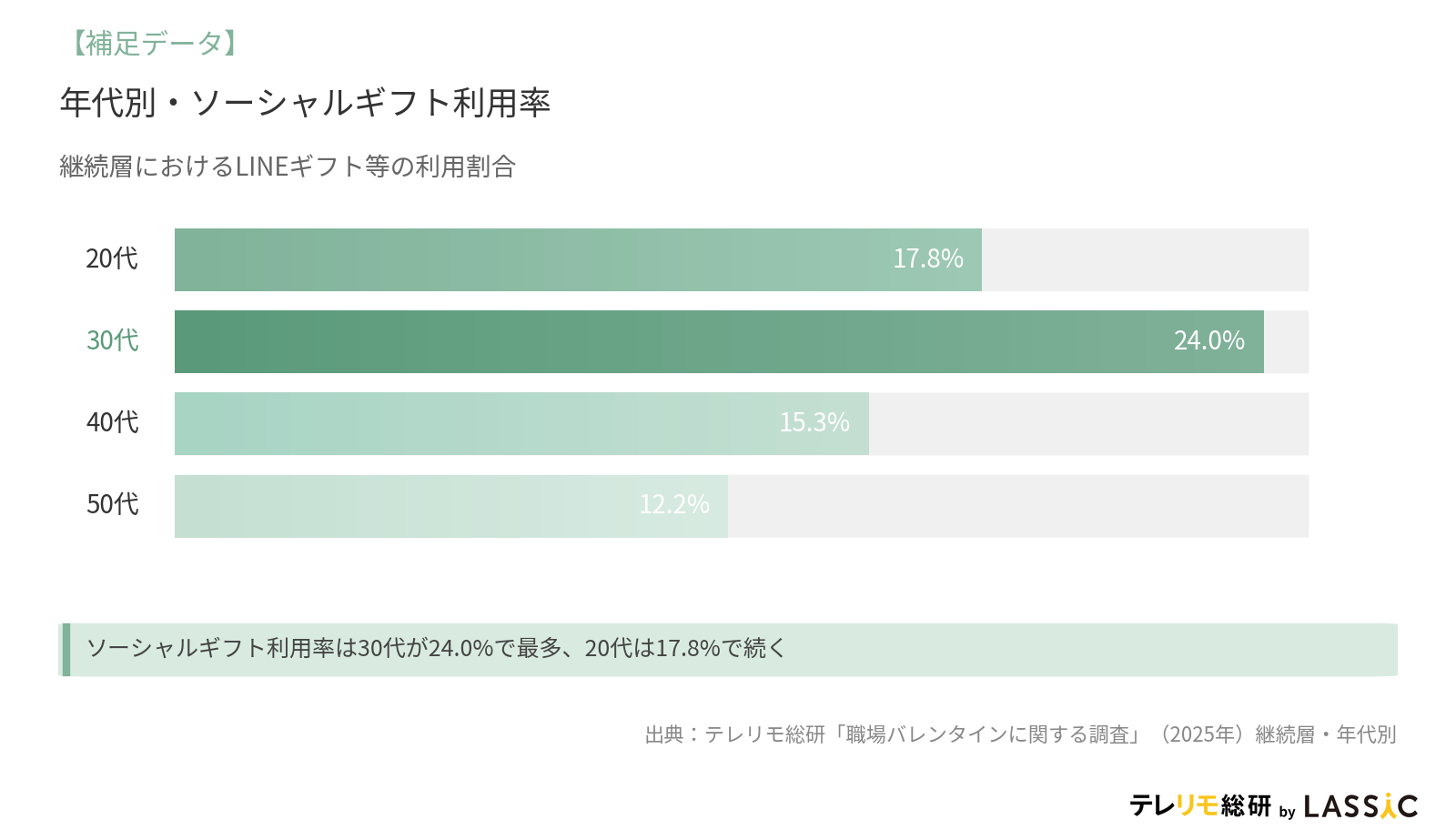 ソーシャルギフトの利用率を年代別に見ると、30代が24.0%で最も高く、20代の17.8%を上回っている。対面で渡せなくても、デジタル手段で気持ちを届けられる選択肢の広がりが、継続を支えている可能性がある。