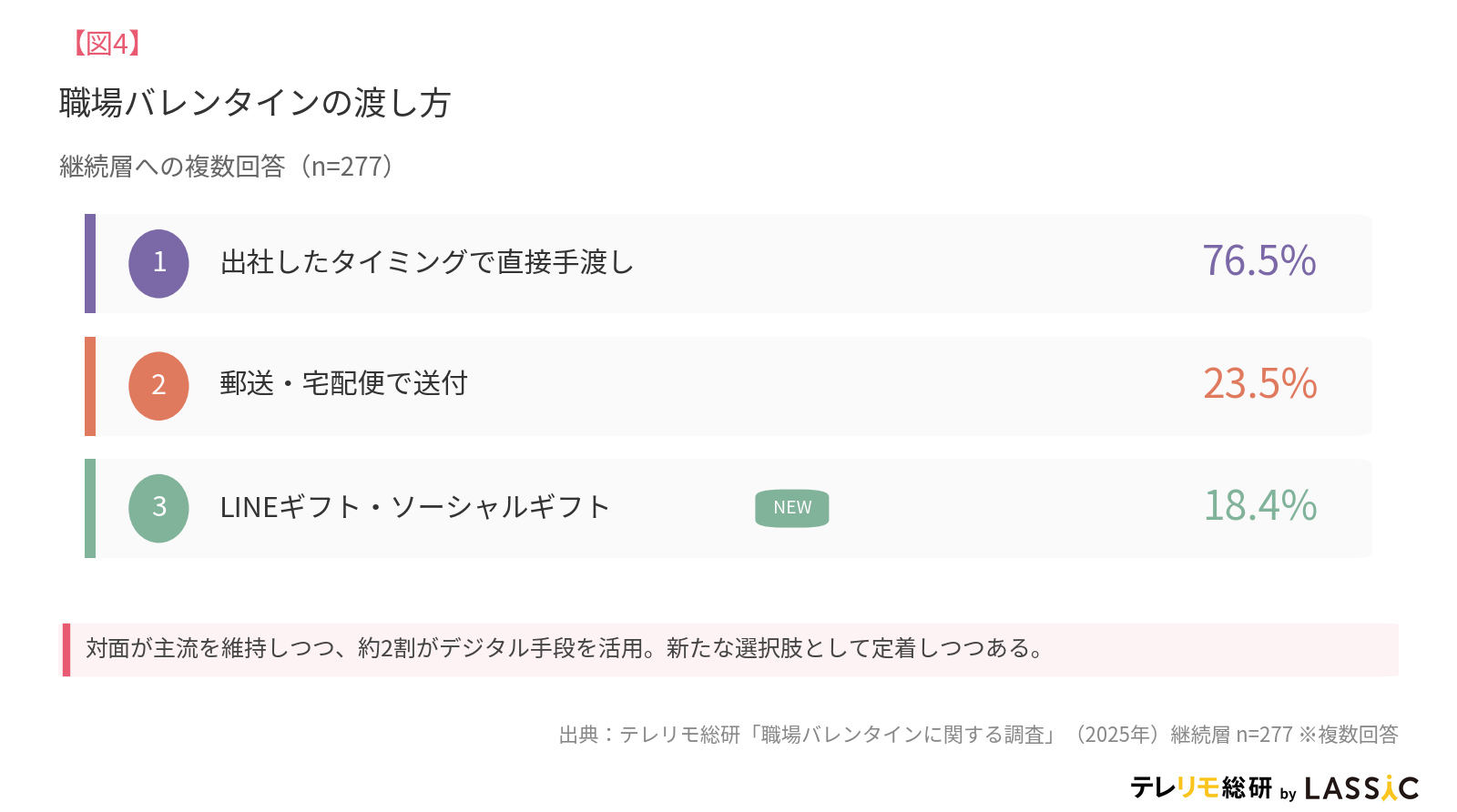 継続層277名に現在の渡し方を尋ねたところ、「出社したタイミングで直接手渡している」が76.5%で最多となった。次いで「郵送・宅配便で送付」が23.5%、「LINEギフト等のeギフトを利用している」が18.4%となった。