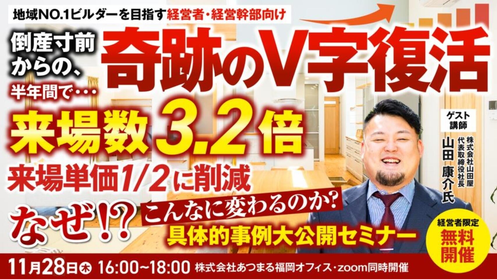 株式会社あつまる(所在地:東京都渋谷区・福岡市中央区)では、2024年11月28日(木)に福岡本社にて、弊社クライアントの株式会社山田屋(所在地:宮崎県延岡市)の代表・山田康介様をお迎えして、具体的事例大公開セミナーを開催いたします。