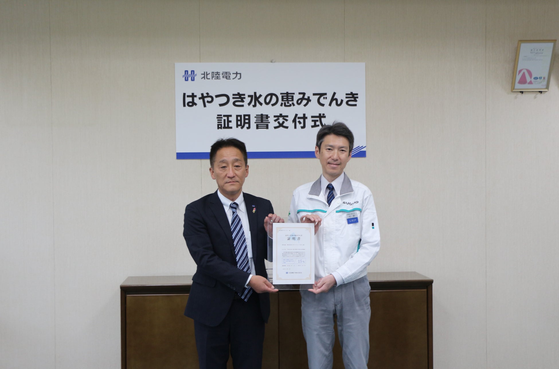 株式会社スギノマシン(富山県滑川市)は、カーボンニュートラルの実現に向けて、クリーンエネルギーの活用などを推進しています。この取り組みの一環として、北陸電力株式会社(以下、北陸電力)が提供する電気料金メニュー「はやつき水の恵みでんき」を、民間第一号として富山県内2カ所の事業所で2025年6月1日より利用を開始しました。6月9日に、スギノマシン本社・早月事業所で北陸電力より証明書の交付を受けました。
