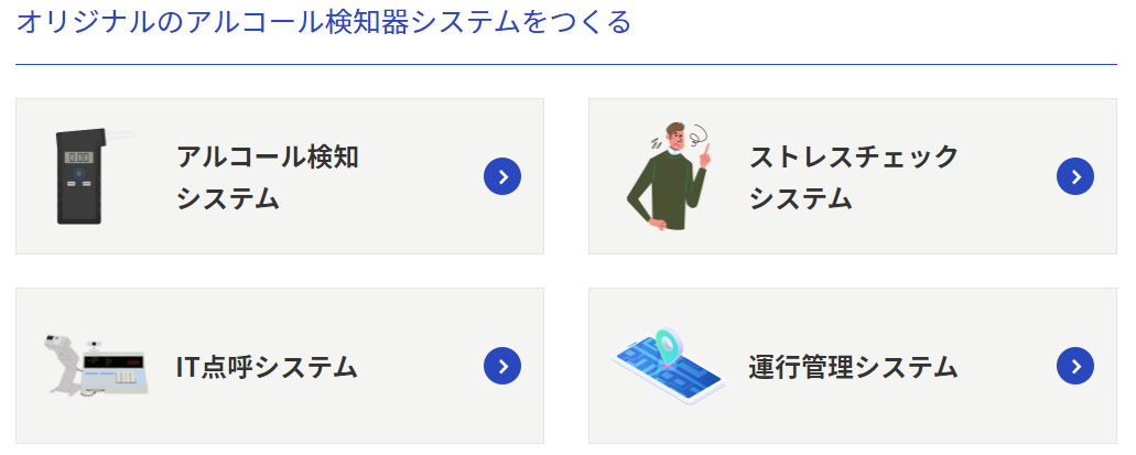 アルコール検知器、IT点呼、血圧、ストレスチェック機器等、さまざまな「安全・安心・健康」を実現するハードウェア機器やソフトウェアサービスを利用し、お客様オリジナルシステムを作成いただくための情報サイトです。