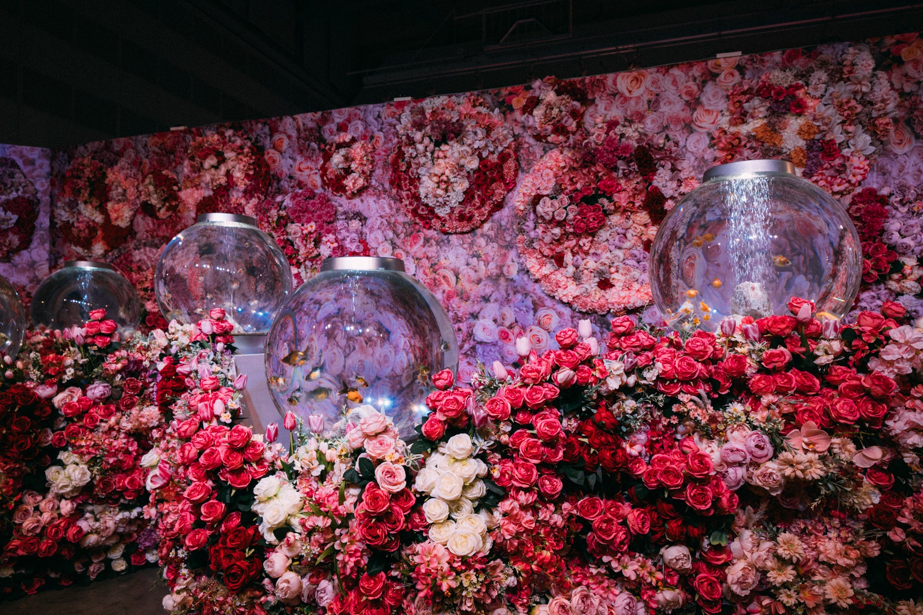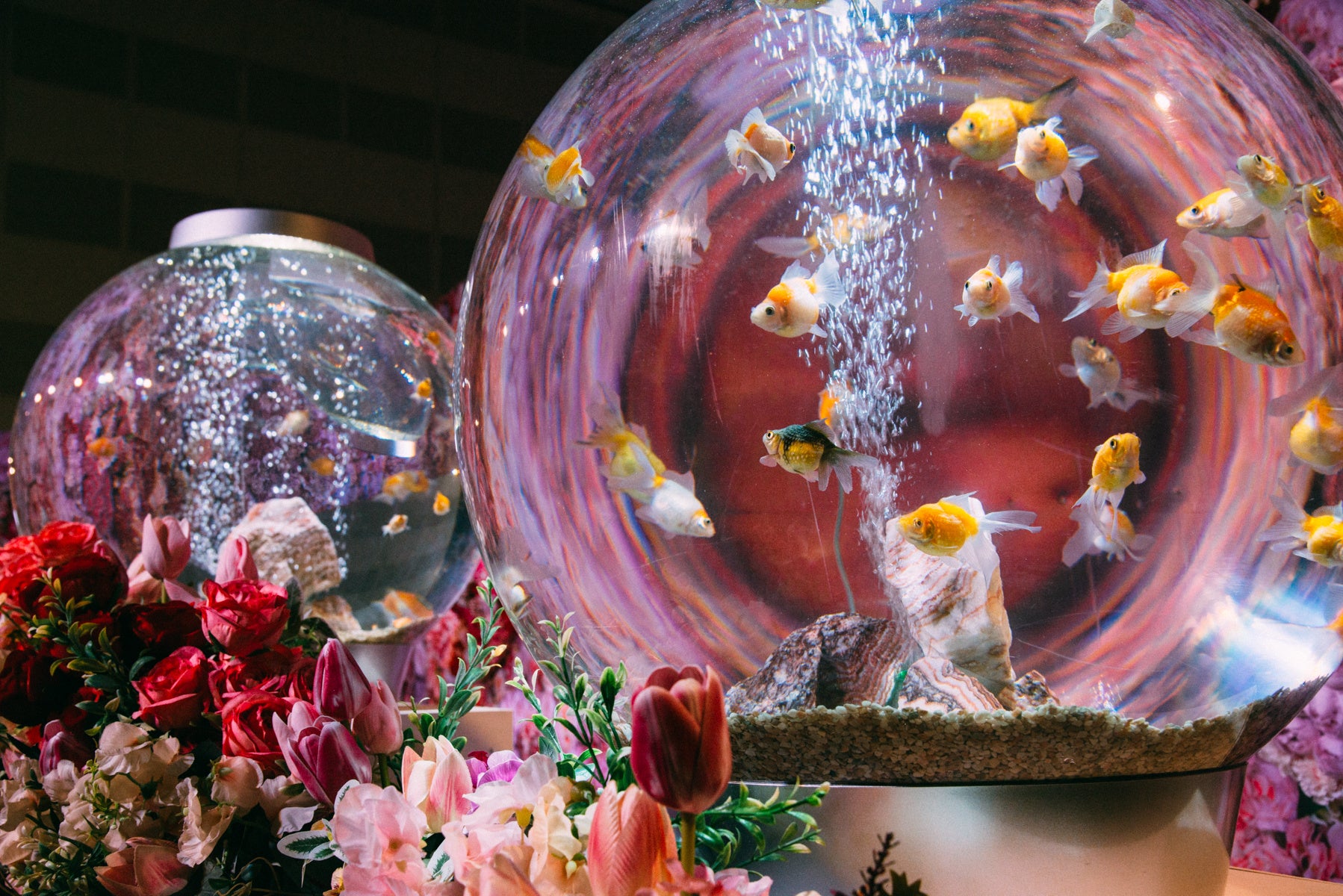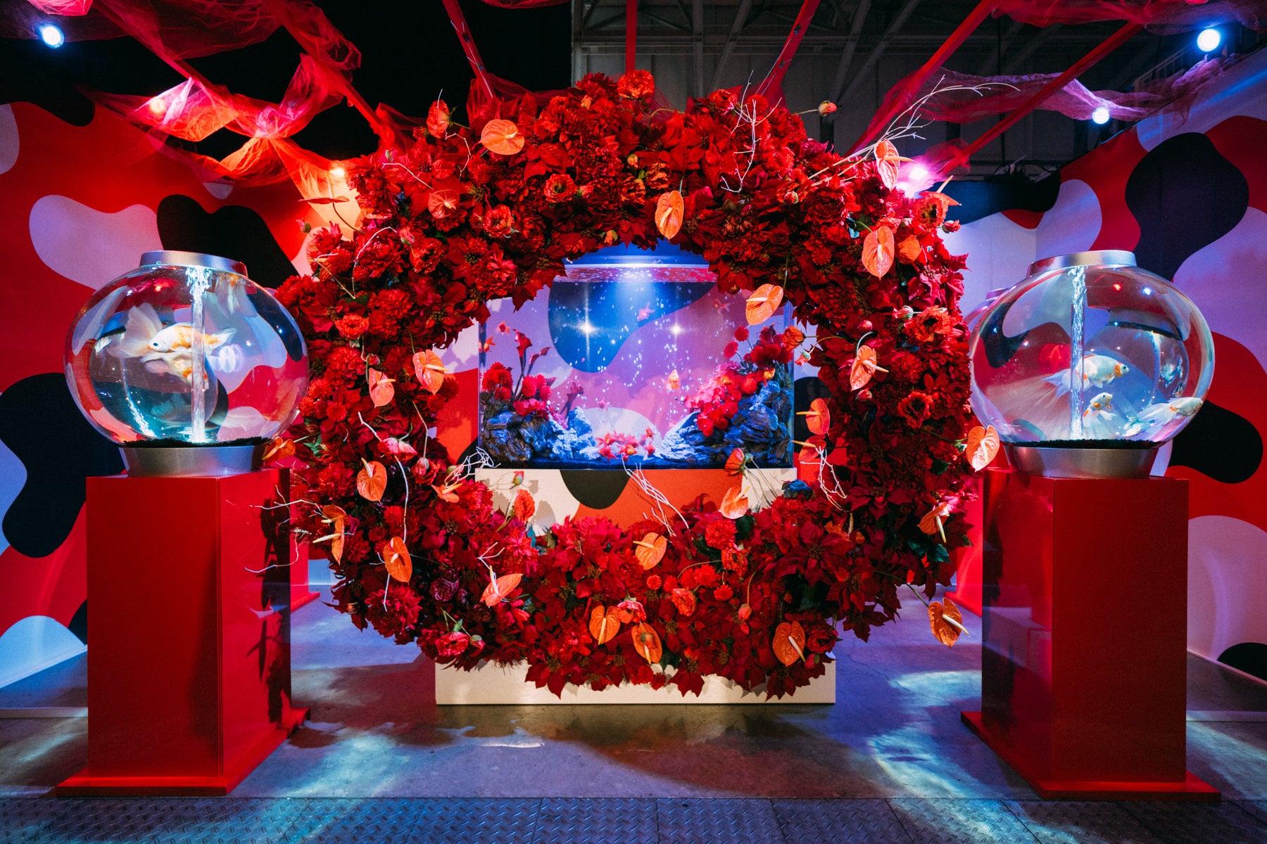 ピンクと赤と白の花束の中を優雅に泳ぐ愛らしい金魚と写真が撮れる人気のフォトスポットです。