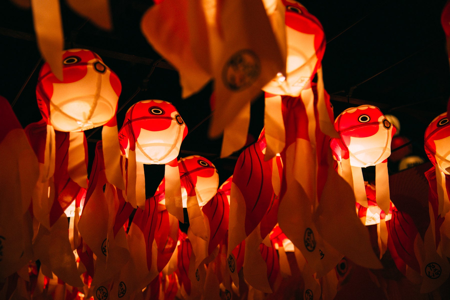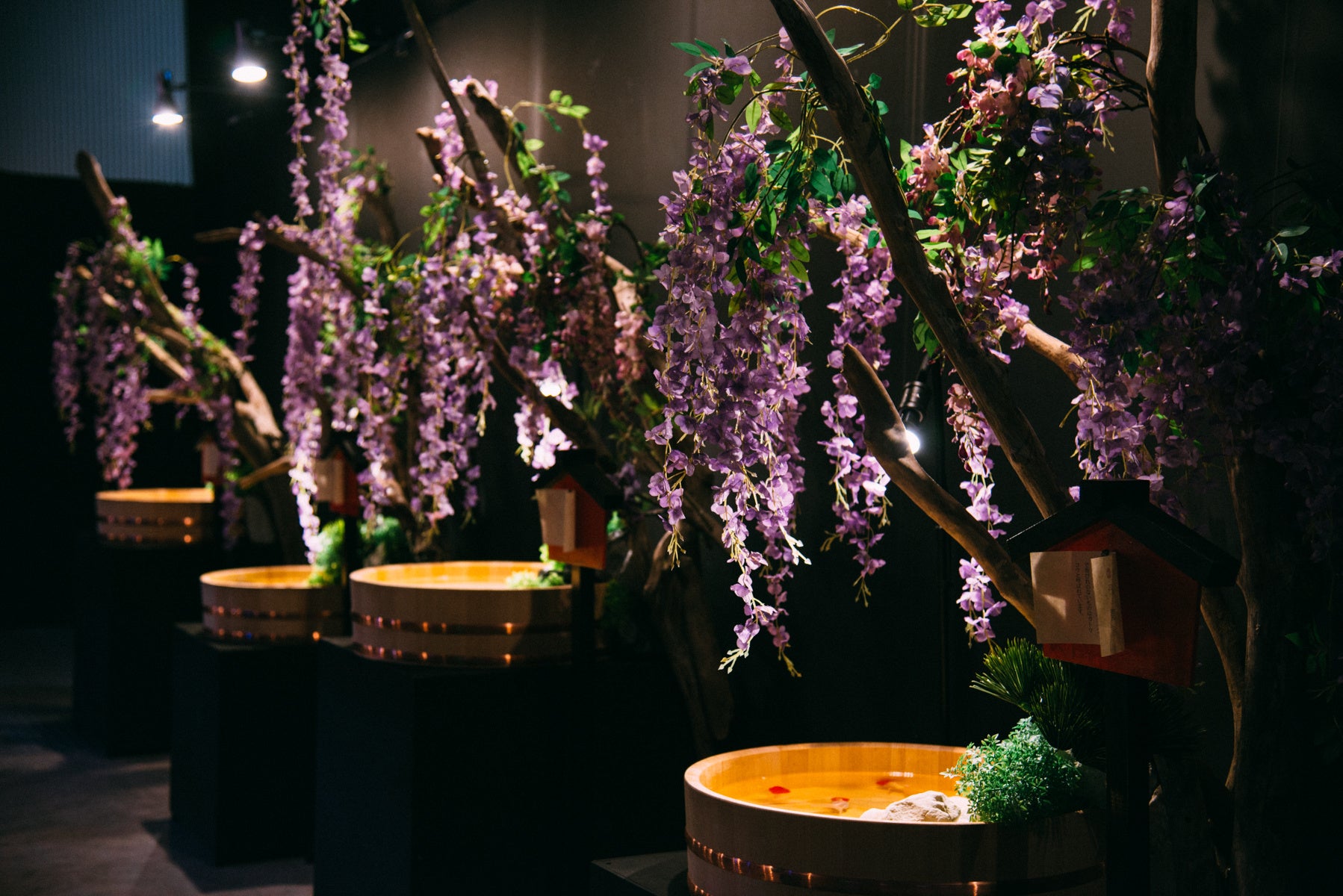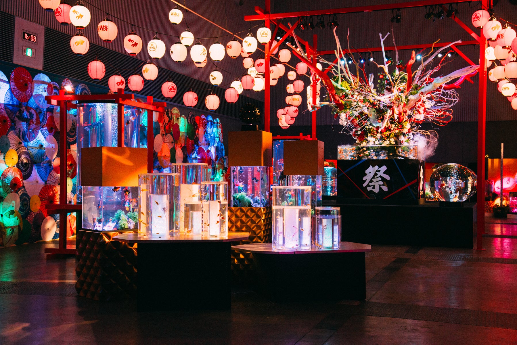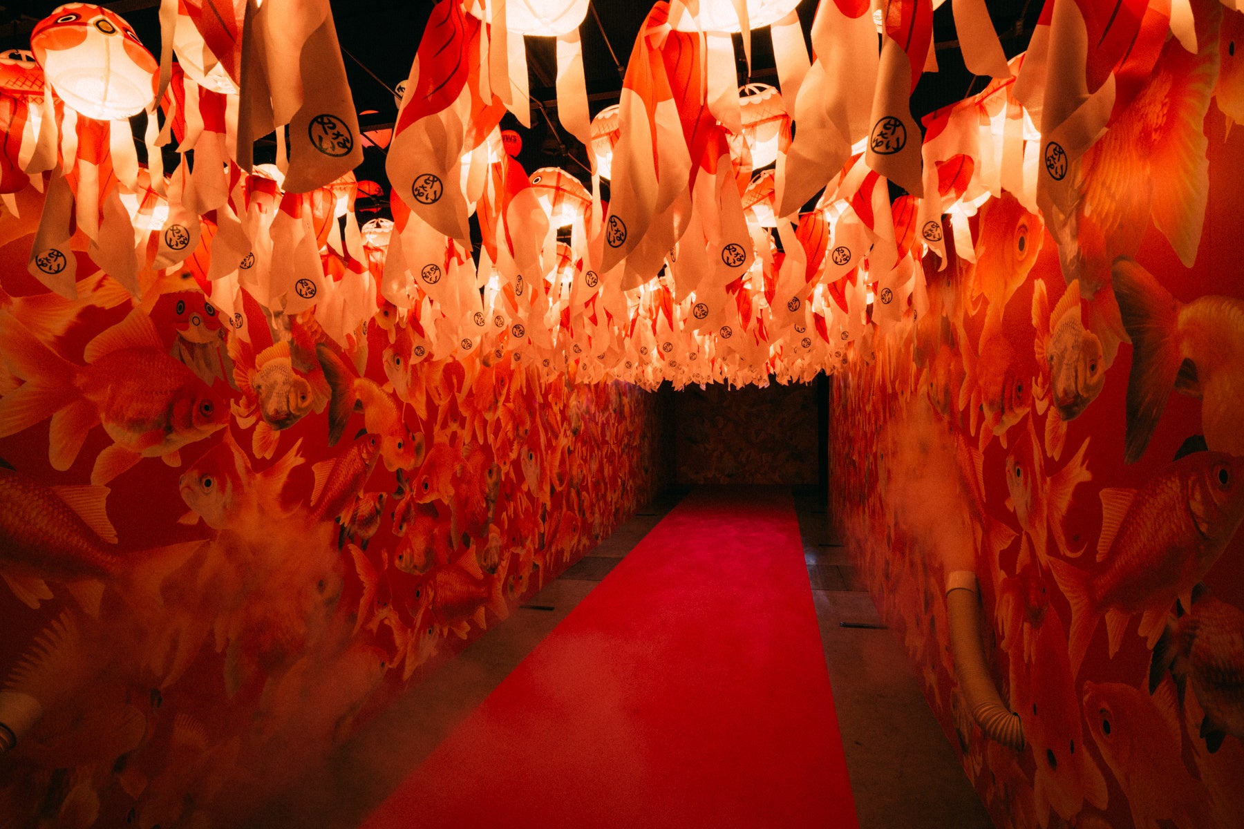 可愛らしい金魚提灯が空中を泳ぎ、温かみのあるオレンジの光に包まれた回遊空間をお楽しみいただけます。