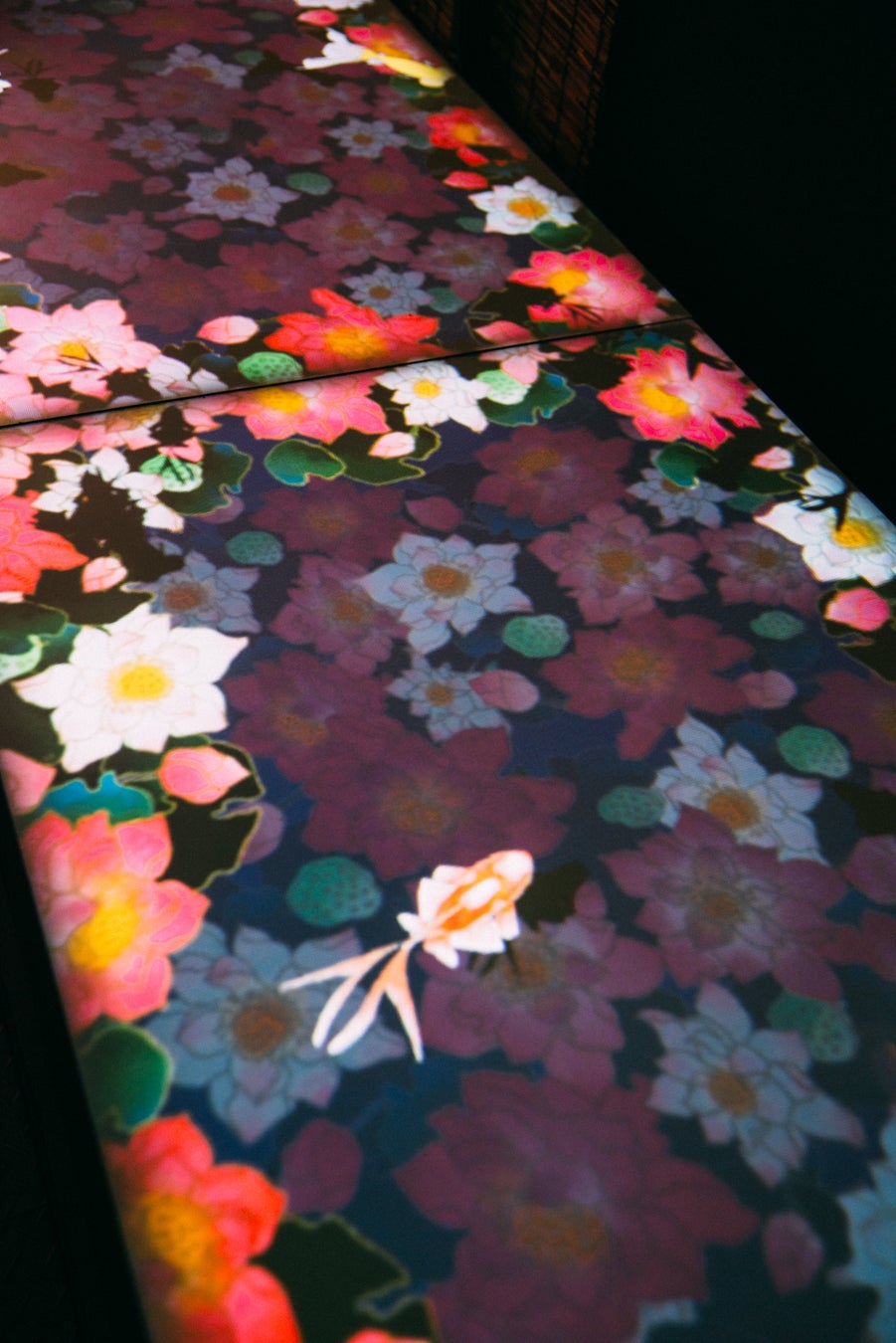 約10mの壁面に緑と花の中を優雅に泳ぐ金魚たちを投影します。大パノラマに映し出された金魚たちがお見送りしてくれます。
