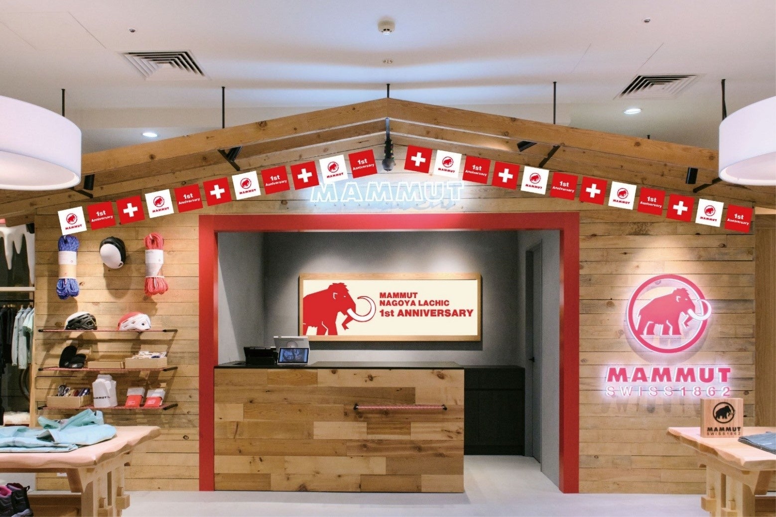 昨年オープンしたマムート 名古屋LACHIC が4月18日で1周年を迎えます。1周年を記念して、マムート 名古屋LACHICでは、4月17日(木)より、1st Anniversary (アニバーサリー)キャンペーンを開催いたします。期間中は、店内にはスイス国旗とマムートロゴをあしらったガーランドが設置され、山小屋をモチーフにしたキャッシャーにもバックパネルが特別に設営されるなど1周年に華を添え、祝祭感が溢れます。特別なこの機会に是非とも足をお運びください。