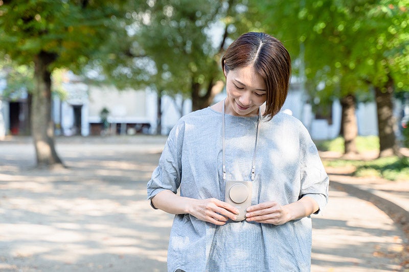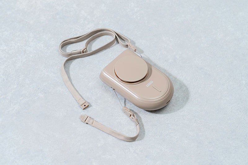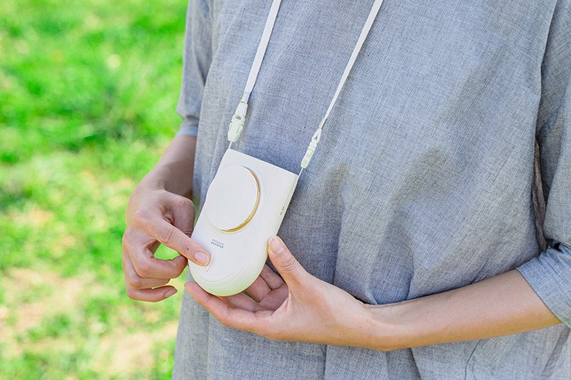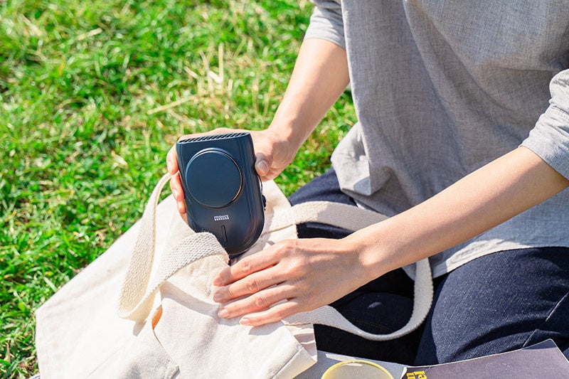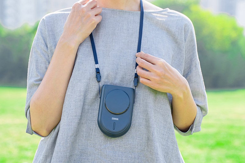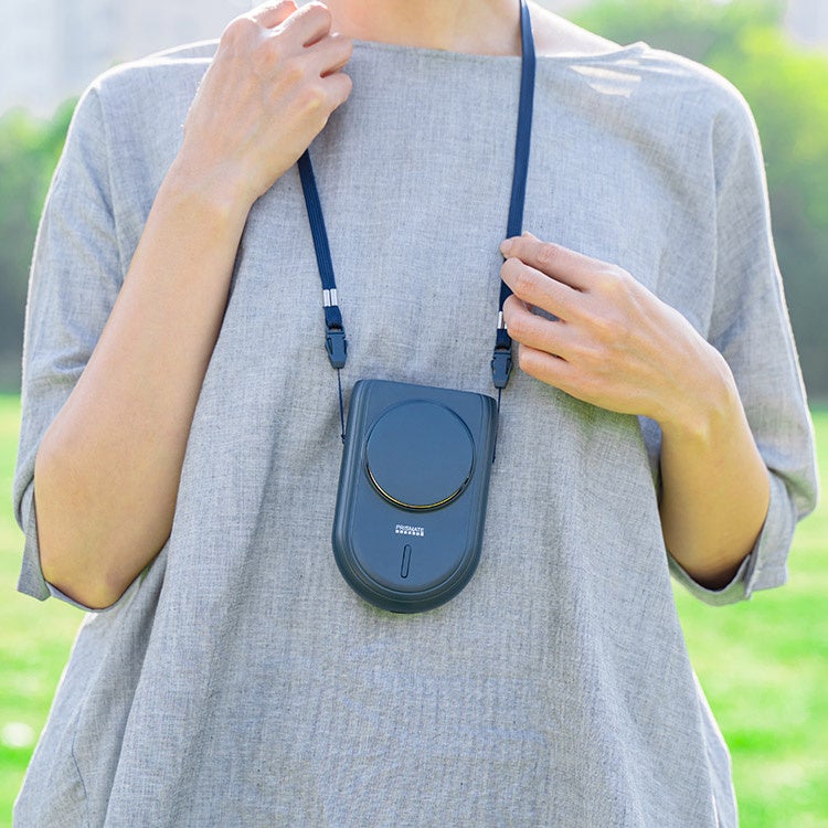 首掛けタイプのハンズフリーファンで、荷物を持っている時はもちろん、野外フェスやアウトドアなど両手を空けておきたいシーンでも大活躍です。付属のネックストラップは幅を広げて首への負担を軽減し、さらに何かに引っかかった時には外れる安心設計です。