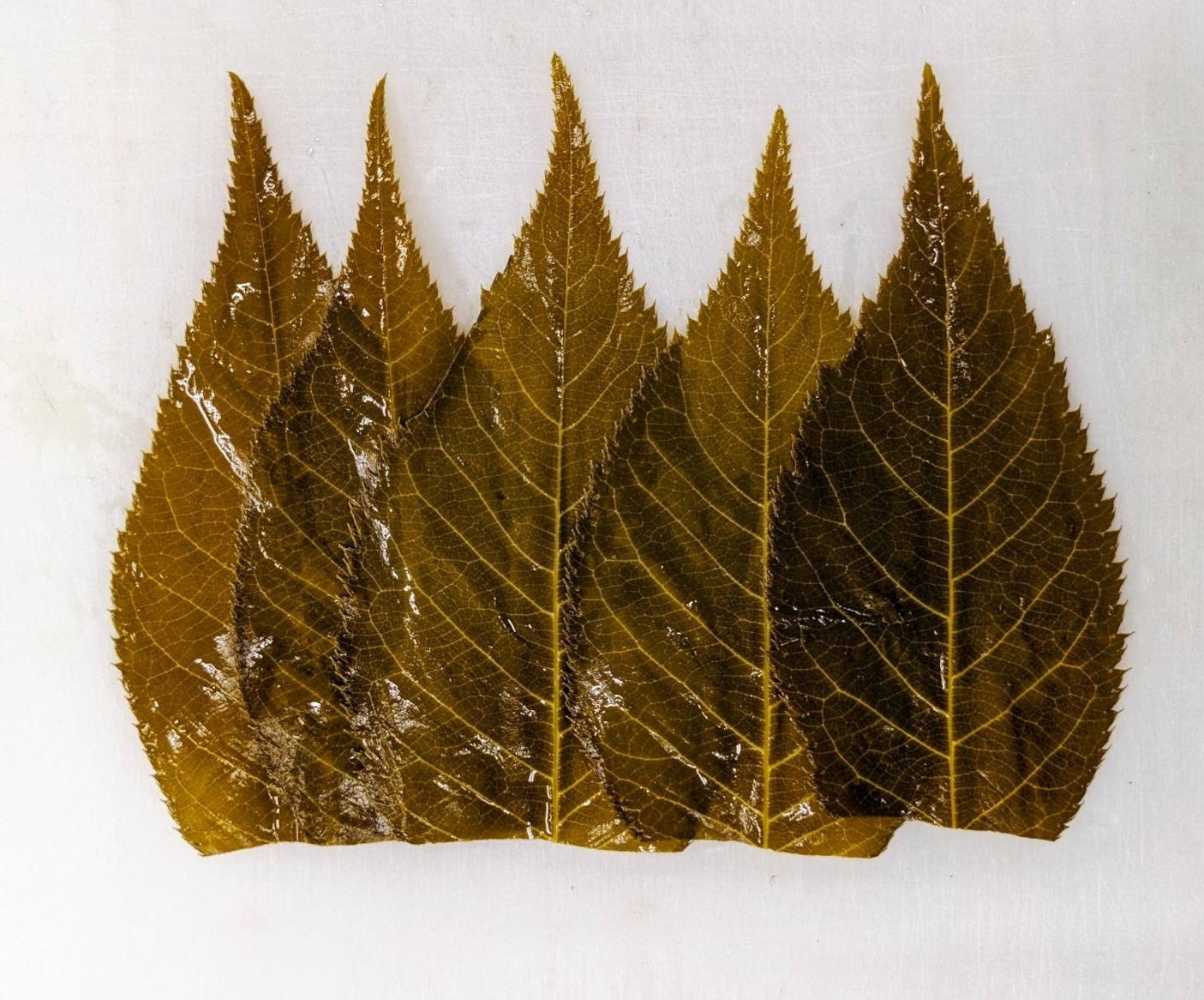 桜餅を包む桜葉には、日本唯一の産地「伊豆半島松崎」の柔らかい桜葉漬けを使用しています。。柔らかく香り高い桜葉が、桜餅の上品な味わいをさらに引き立てます。※桜餅の桜葉は食べることができます。