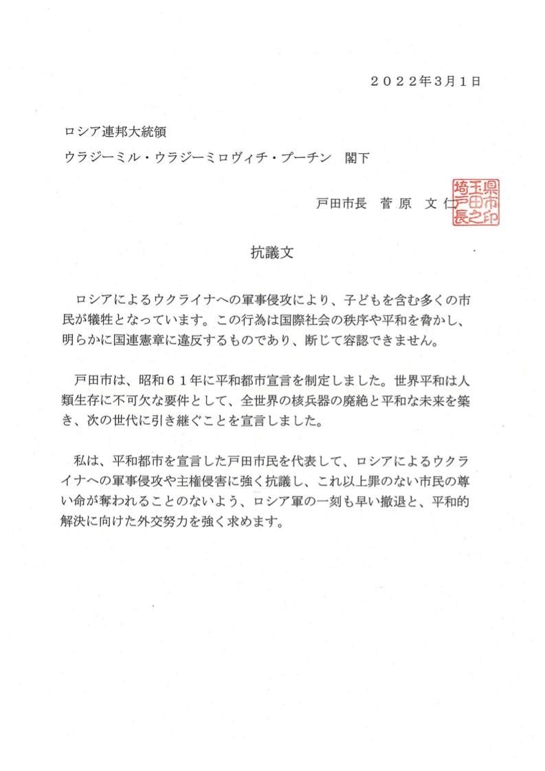 埼玉県戸田市は、ロシアによるウクライナへの軍事侵攻を受け、令和4年3月1日付で、別添の抗議文を駐日ロシア連邦大使館へ送付しました。