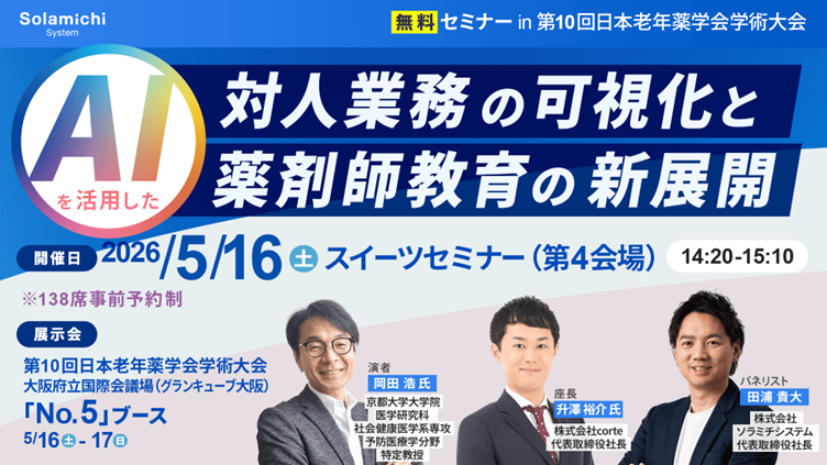 株式会社ソラミチシステム(以下、「当社」)は、2026年5月16日(土)、17日(日)に大阪府立国際会議場(グランキューブ大阪)にて開催される「第10回日本老年薬学会学術大会」にブースを出展し、クラウド電子薬歴『CARADA 電子薬歴 Solamichi』およびAIによる採点機能の展示を行います。
