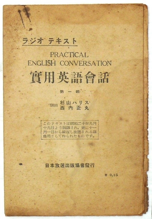 未裁断。表紙に「ラジオテキストPRACTICAL ENGLISH CONVERSATION 実用英語会話 第一輯 講師 杉山ハリス 西内正丸 このテキストは昭和二十年九月十九日より開講され、更に十一月一日から繰返し放送される講座用として作られたものです。日本放送出版協会発行 ¥0.35」と印刷されています。