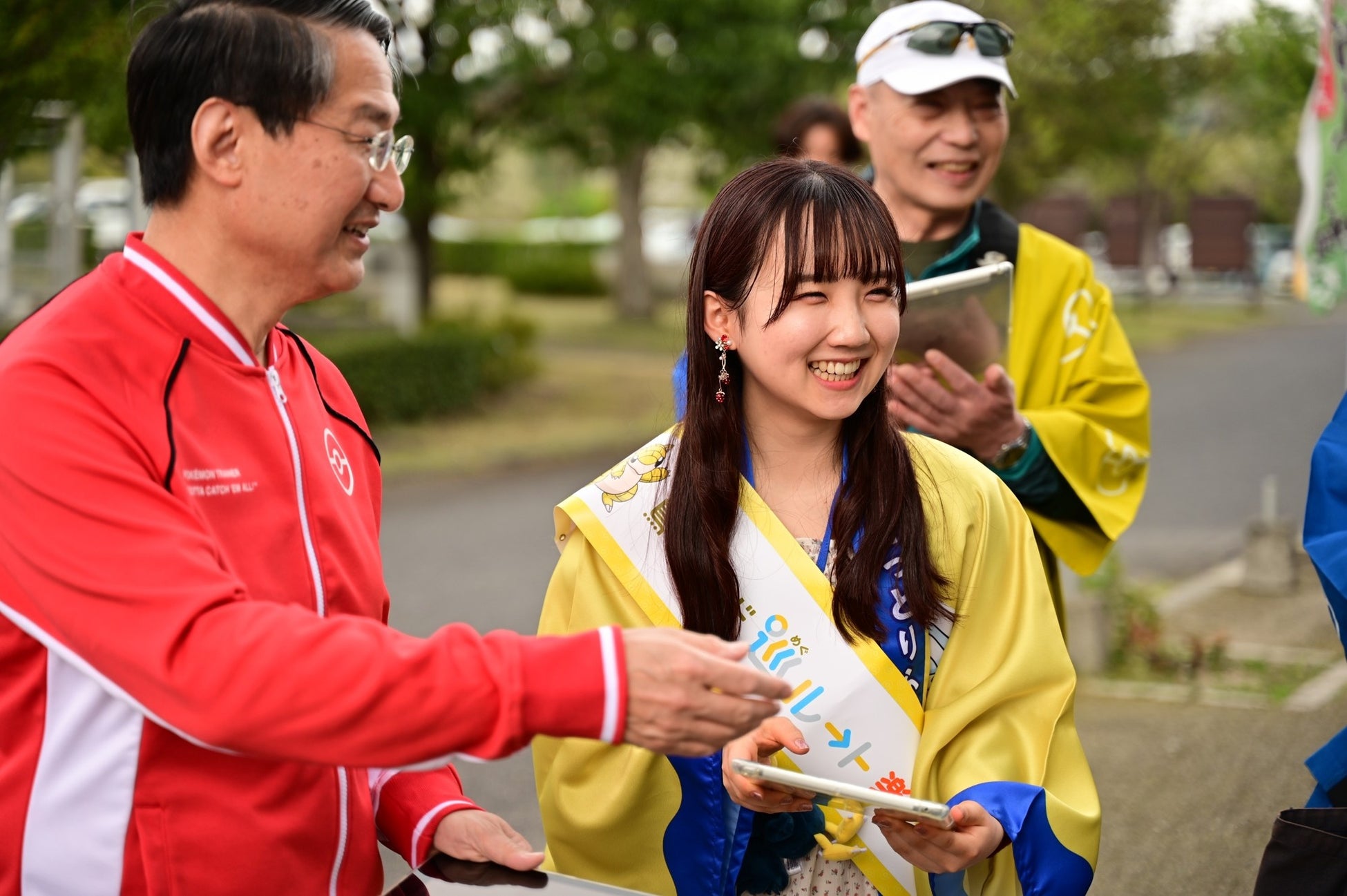 YouTubeで公開されているポケモンウェブアニメシリーズ最新作「ヤミカラスと真夜中のぼうけん」の主人公「ヒロ」役を務める鳥取県出身の注目の声優、田中苑希さんをお招きし、「鳥取サンド巡ルート2025楽しみ大使」に任命させていただきました。委嘱式では平井知事から委嘱状とタスキが手渡されました。田中さんからは「ポケモンを捕まえるという憧れを叶えてくれる『ポケモンGO』と、鳥取県の豊かで美しい自然とのコラボレーションはとても心躍るもの。大使としてどちらの魅力も伝えられるよう精一杯頑張りたい」とコメント。さらに、「絶対、絶対に忘れられない冒険をしようよ!」と、ヒロのセリフでキャンペーンスタートの掛け声を披露いただき、平井知事と一緒に鳥取県公式ルートのひとつ「花回廊を外から見てみようルート」も体験いただきました。ルートのなかでは、ポケモンをゲットするたびに田中さんにサンドコラボグッズが贈呈されました。平井県知事も「鳥取の名所を巡りながら商品もゲットしてください。田中苑希さんにも我々の大使になっていただきましたので、みんなで一緒に楽しみ“たいし”(=大使)。」とコメントしました。