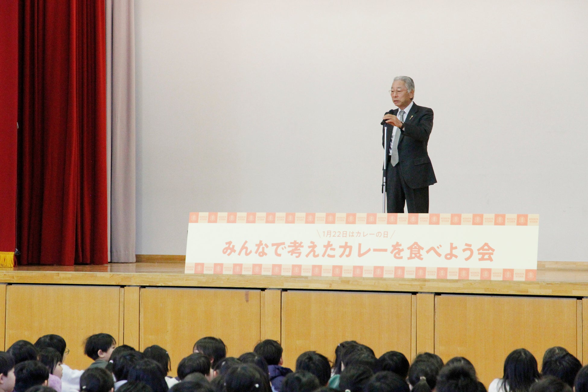 菊池会長が「こんにちは。」と挨拶をすると、児童からも元気な「こんにちは!」の挨拶が返ってきました。菊池からは、このプロジェクトが始まった経緯の他、このプロジェクトが2年目なこともあり、「毎年同じでいることは進歩がない。みなさんも学年1年上がる度に勉強して進歩していくように、会社も同じように進歩をして、今年とは違うものを出していく。それが大人の仕事です。それを考えてカレーを味わってほしい。」と話をしました。また、今年も呼んでいただけたことに感謝を示しつつ、「繋がりがもてることはいいこと。我々も一生懸命努力をして、お話に答えていきたい。」と挨拶を締めました。