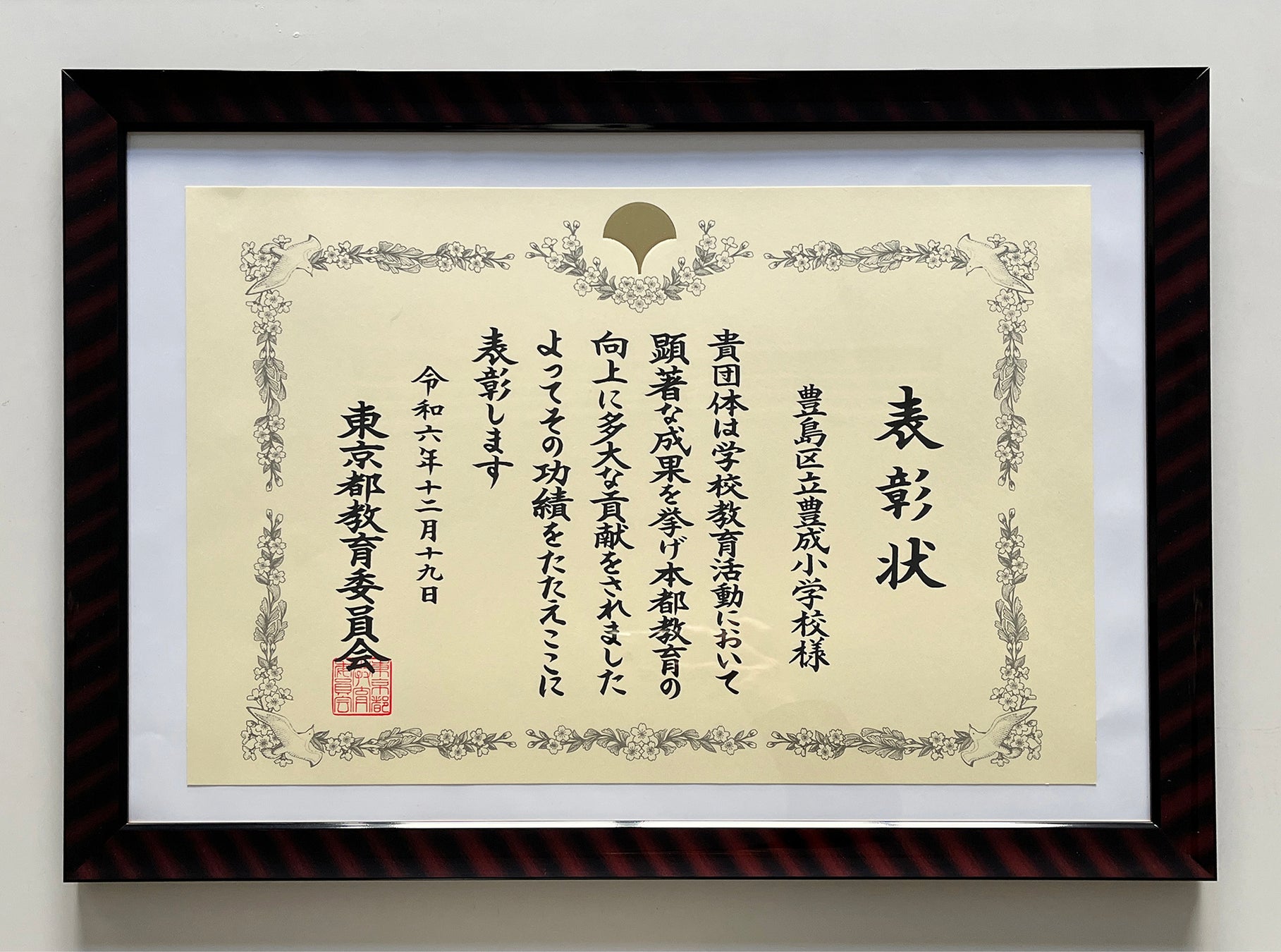 「東京都教育委員会職員表彰」は、東京都の教育の発展、学術、文化の振興に貢献し、その功績が顕著で、かつ勤務成績の優秀な職員および優れた教育実践活動・探究活動を行っている学校・グループを毎年表彰するものです。本プロジェクトの内容が、「企業との協働による創造的・探求的学習の推進」として評価され、令和6年度の「団体表彰」として、豊島区立豊成小学校が表彰されました。