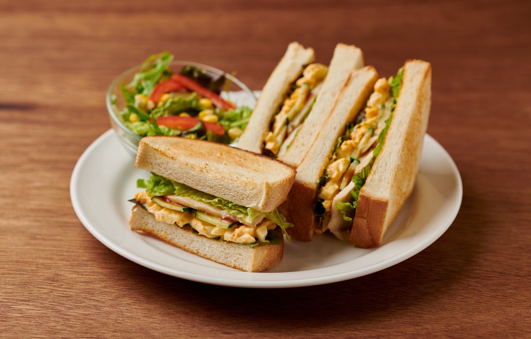 タマゴ・ローストチキン・きゅうり・トマト・サニーレタスの入った定番のサンドイッチ。約20年、味わいが変わらず長年愛されているメニューです。パンは柔らかいものを使用しており、焼いてご提供する「焼きたてサンド」と、野菜のみずみずしさを楽しんでいただける、「焼かないサンド」のどちらもお選びいただけます。