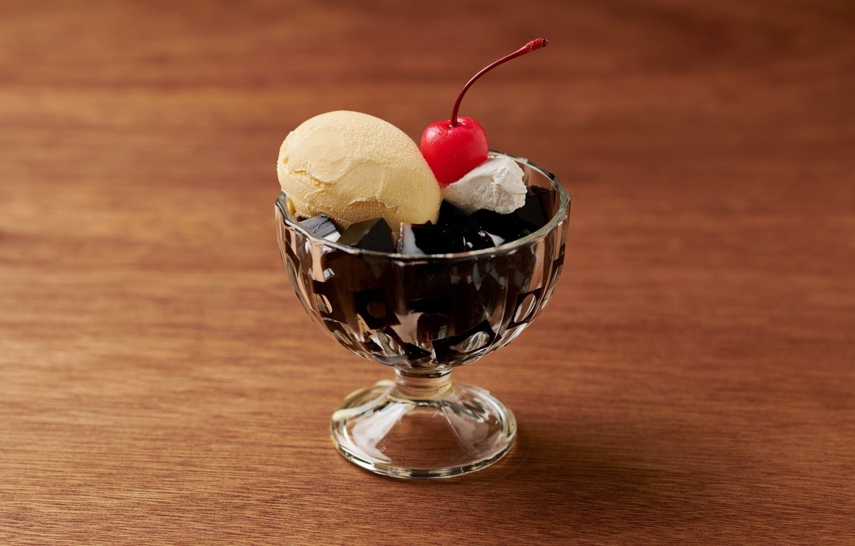 看板商品である濃厚なコクやキレが特長の炭火珈琲を抽出し、店内で手作りしている商品です。赤いチェリーを添え、昔ながらの喫茶店を思わせる見た目に仕上げました。つるんとした食感が特徴のゼリーを濃厚な味わいのバニラアイスやホイップクリーム、シロップで甘さを調整しながらお楽しみください。