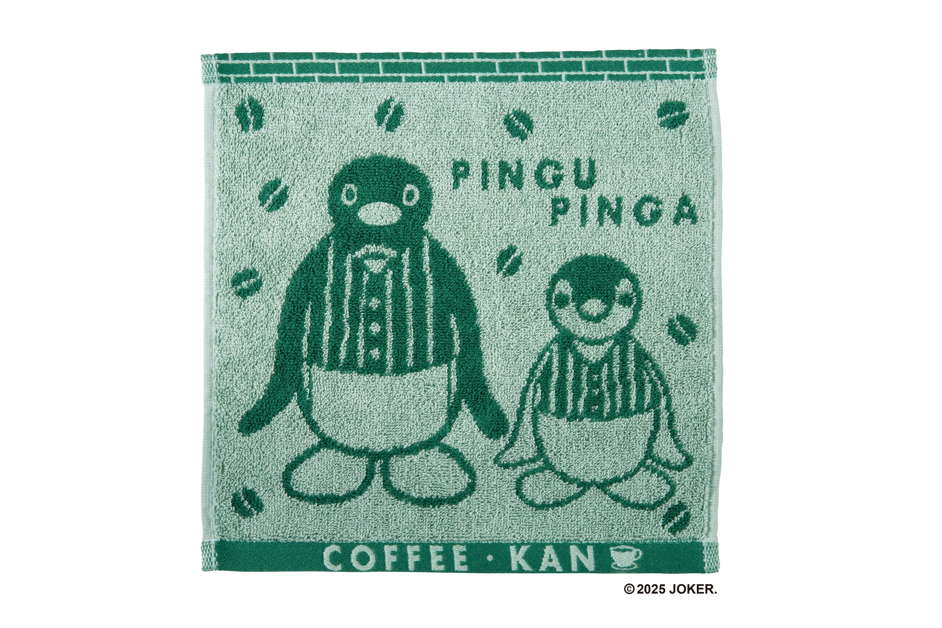 「ジャガードタオル」は、『珈琲館』の制服を着たピングーとピンガが描かれた限定オリジナルデザインで、吸収性に優れたふんわりやさしい生地がポイントです。タオルの上部には、店舗内装をイメージしたレンガの絵柄をあしらい、『珈琲館』らしさとピングーの可愛らしさをぎゅっと詰め込みました。